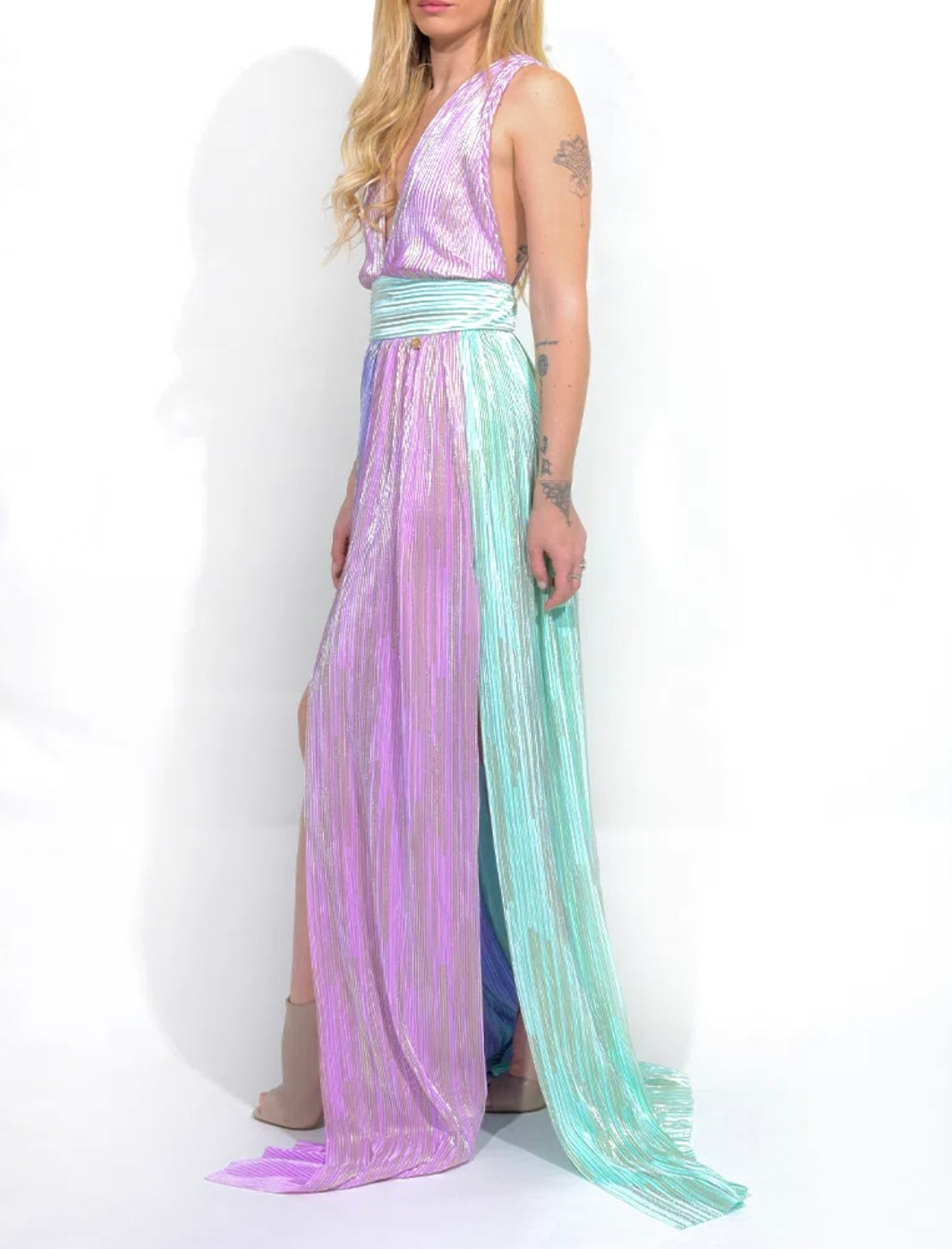 Abito cerimonia in tessuto plissè laminato tricolore Made in Italy firmato Francesca Conoci.