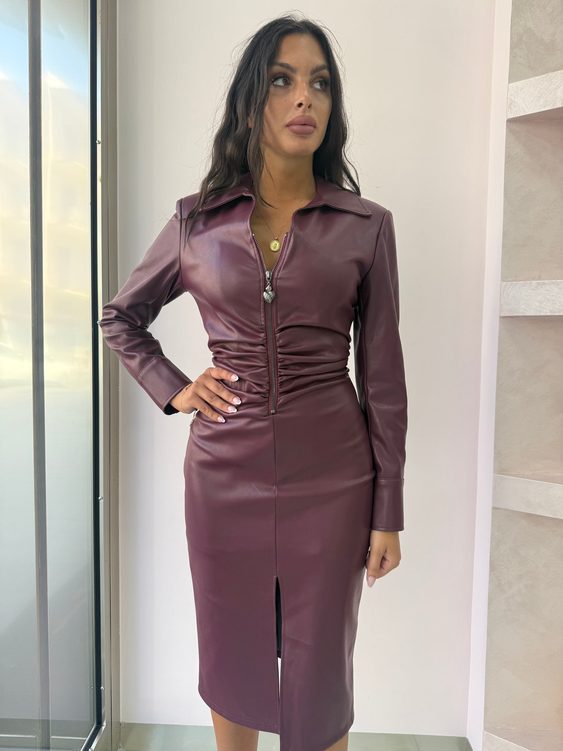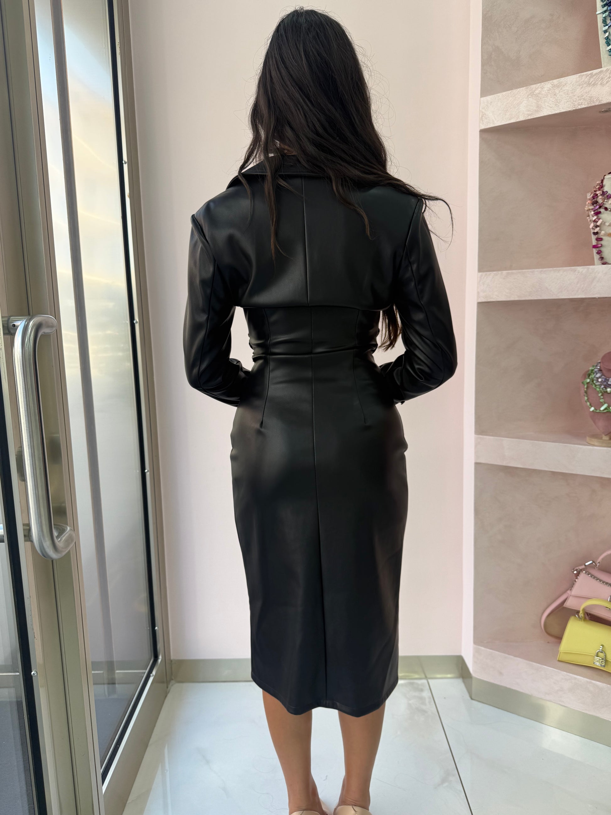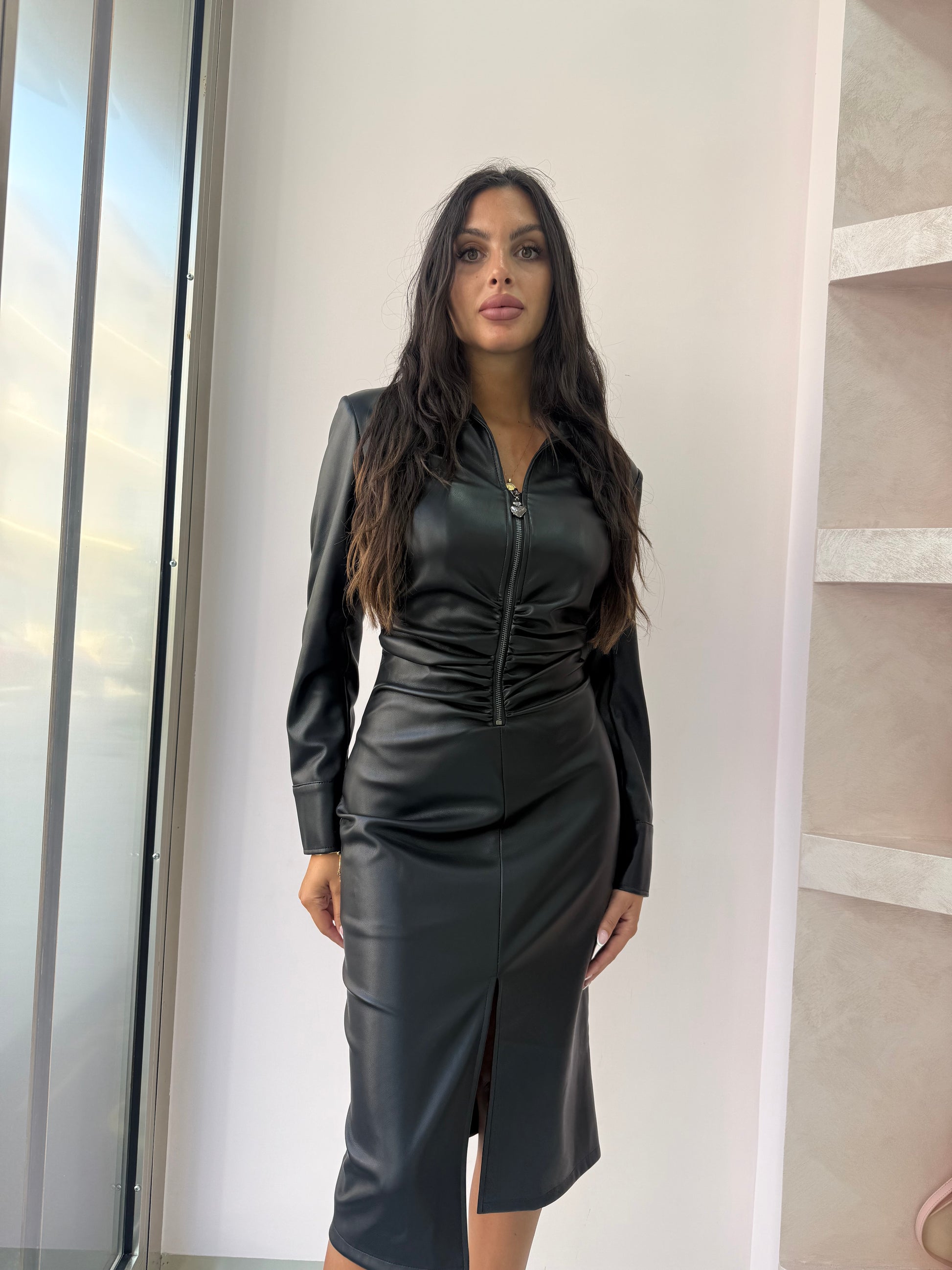 Abito in similpelle nera con zip centrale che arriva fino al décolleté, permette di regolare l’apertura.
