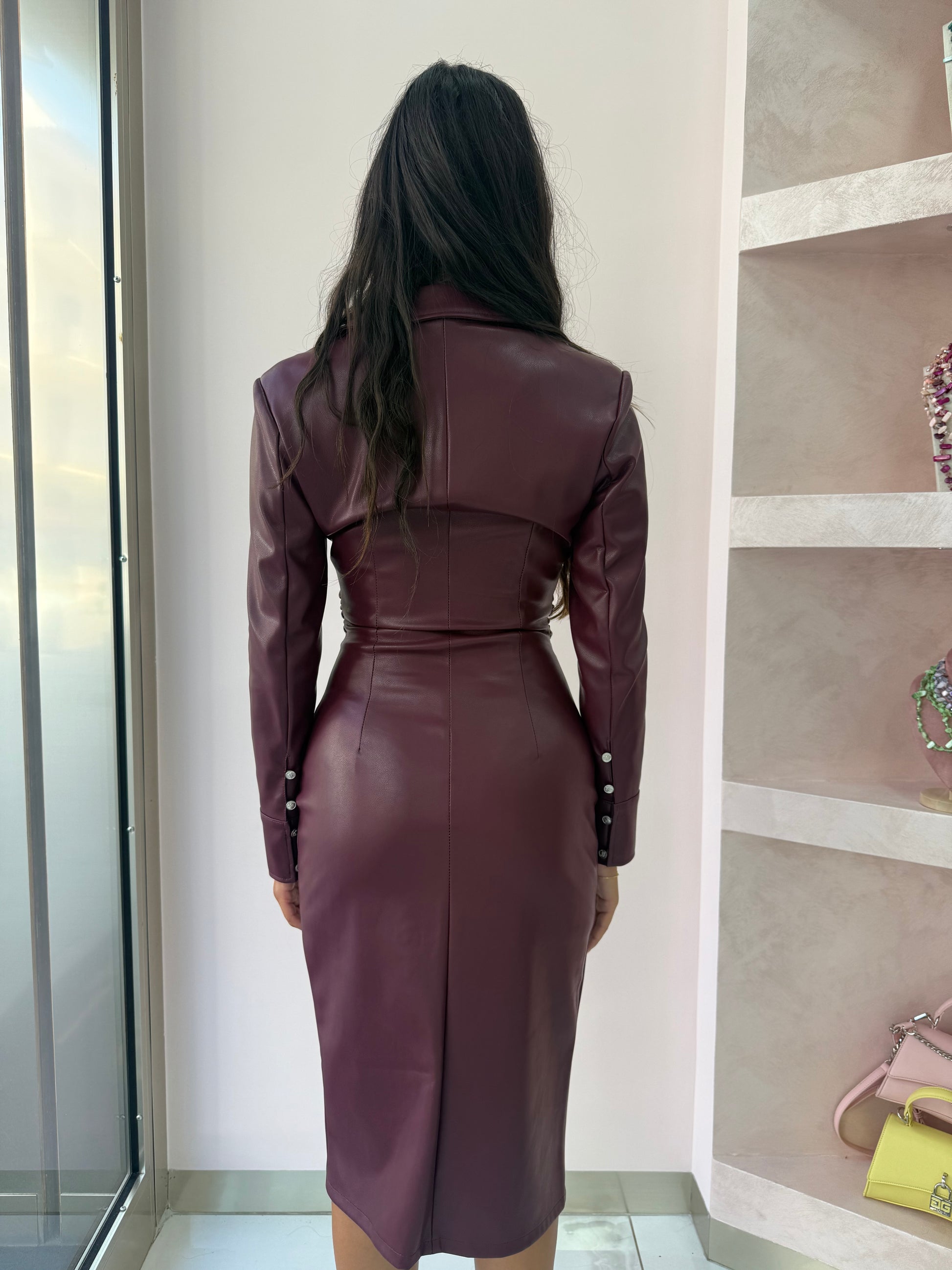 Il corpetto É aderente con arricciatura frontale che valorizza la figura, la gonna Midi a tubino. Maniche lunghe e aderenti, con dettaglio cucitura sui polsini. Spacco frontale verticale, conferisce sensualità e movimento. Taglio sagomato, mette in risalto il punto vita