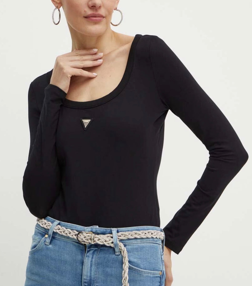Body per donna griffato Guess in cotone elasticizzato. Girocollo ampio, maniche lunghe, iconico triangolo sul petto.