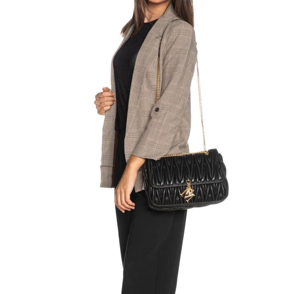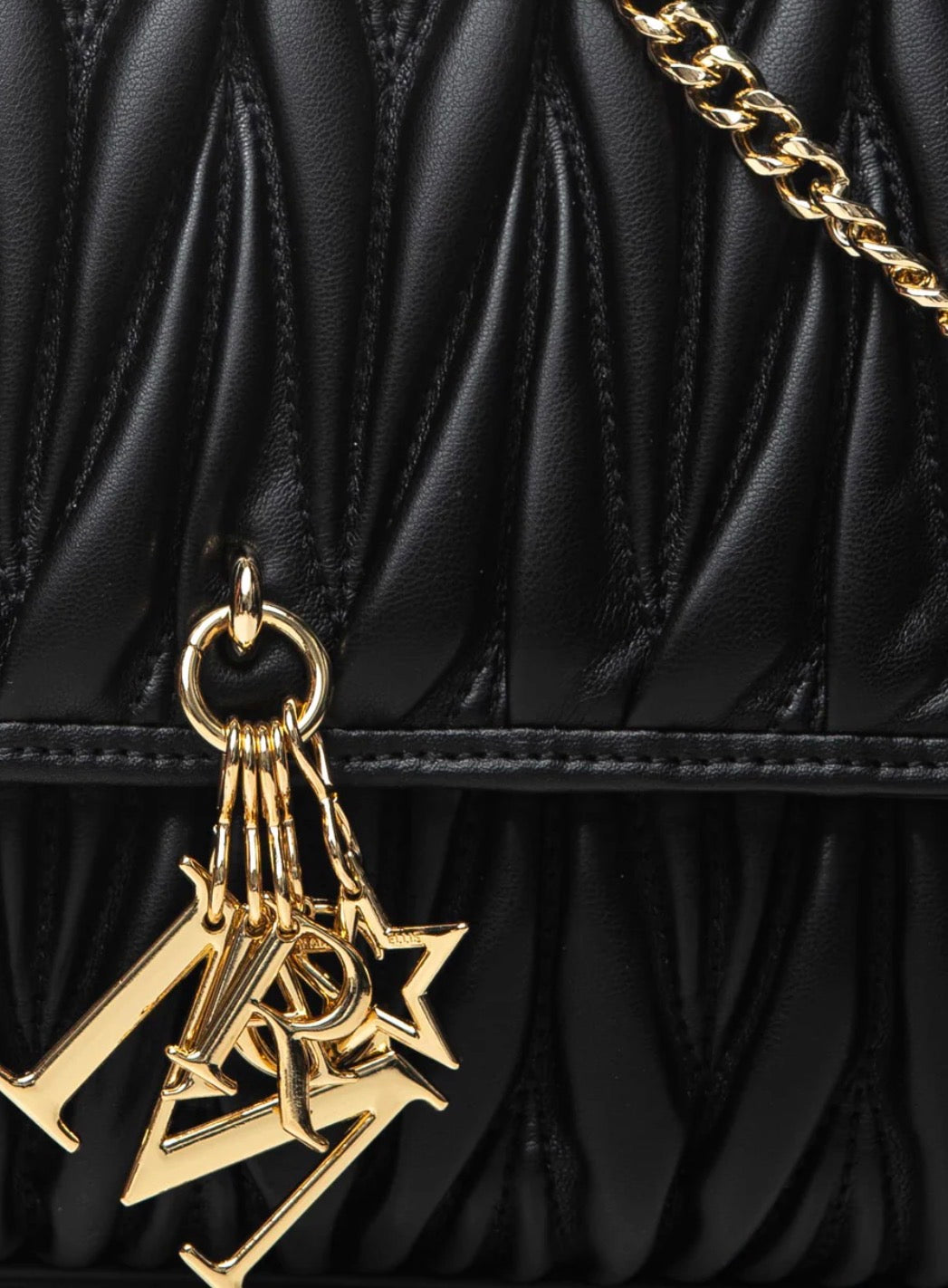 Borsa Marc Ellis Sissy 33 da donna in ecopelle arricciata, modello shoulder large, con charms lettere logo in metallo dorato agganciate mediante anello sulla patta che copre un vano interno con chiusura zip ed una tasca esterna, chiusure magnetiche coperte e tracolla scorrevole in catena per un utilizzo versatile a spalla