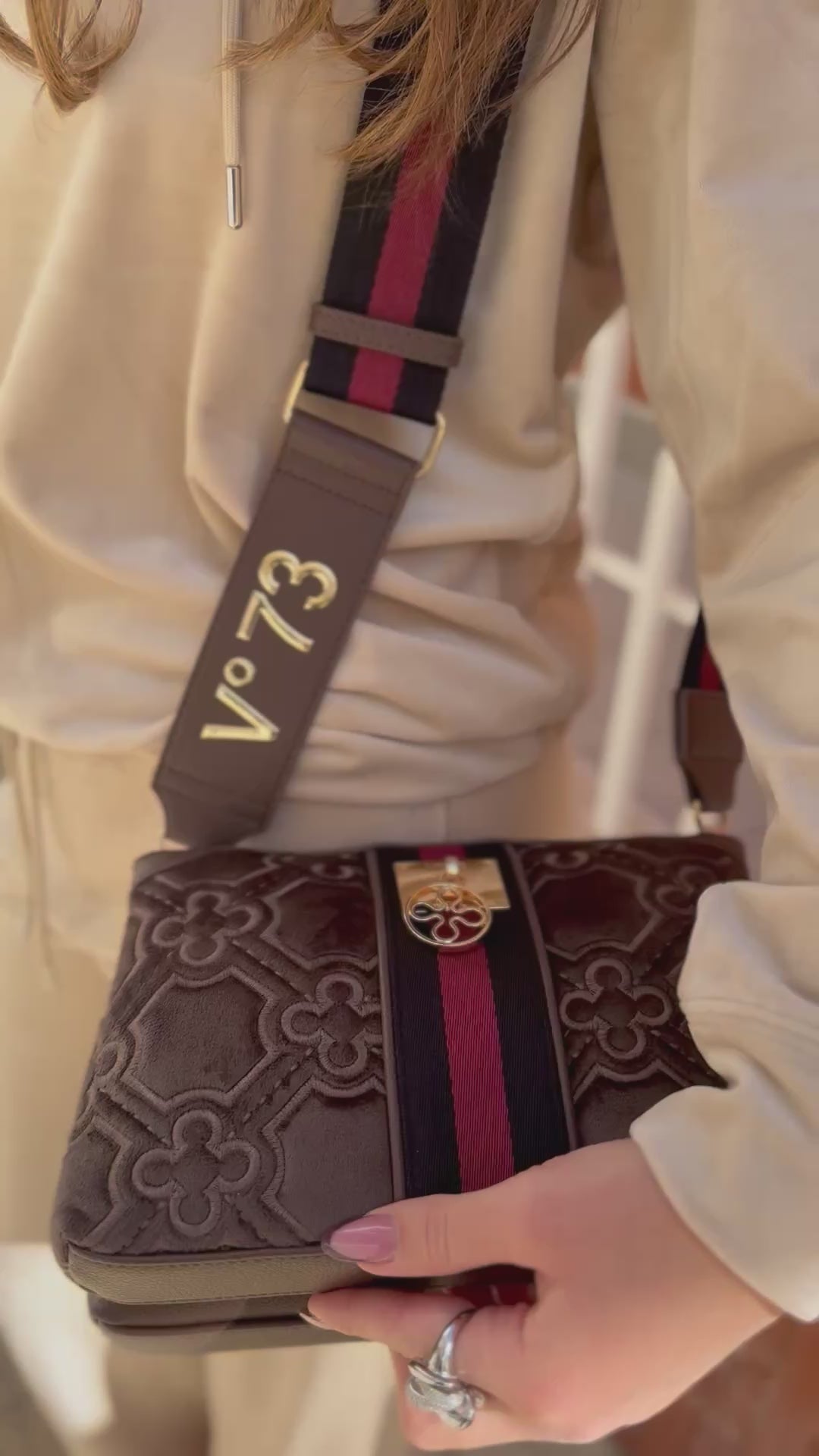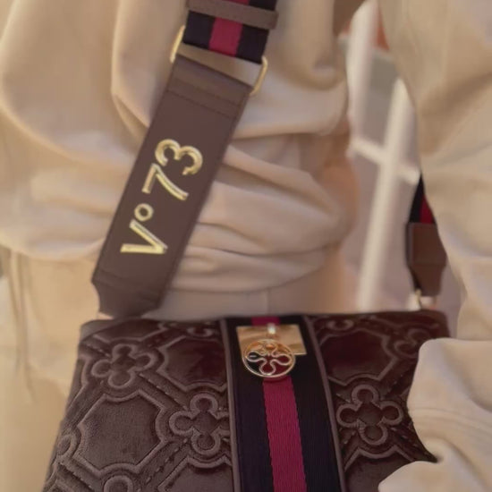 Borsa a spalla realizzata in velluto con ricamo all over, personalizzata con fiorone metallico e nastro centrale.
