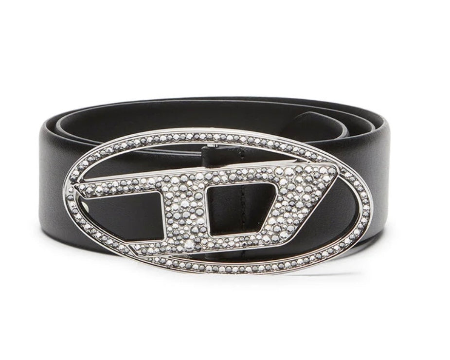 Cintura da donna realizzata in pelle italiana di alta qualità, chiusa con una fibbia Oval D ricoperta da cristalli. Larghezza: 4 cm.