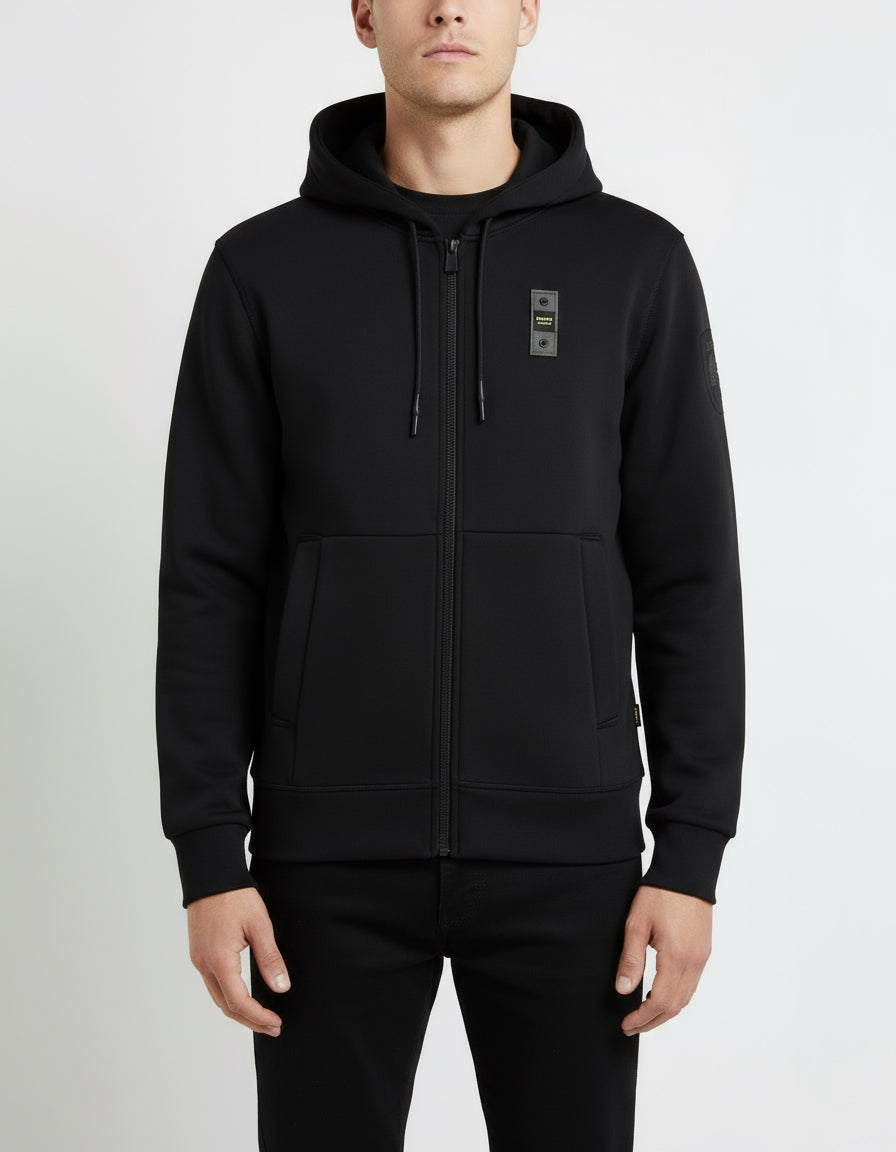 Felpa modello Colby in neoprene, chiusura centrale con zip, tascche anteriori oblique , cappuccio con coulisse, passante sul petto Blauer USA, patch sovraimpresso sul braccio sinistro, tessuto neoprene molto confortevole e resistente al maltrattamento.