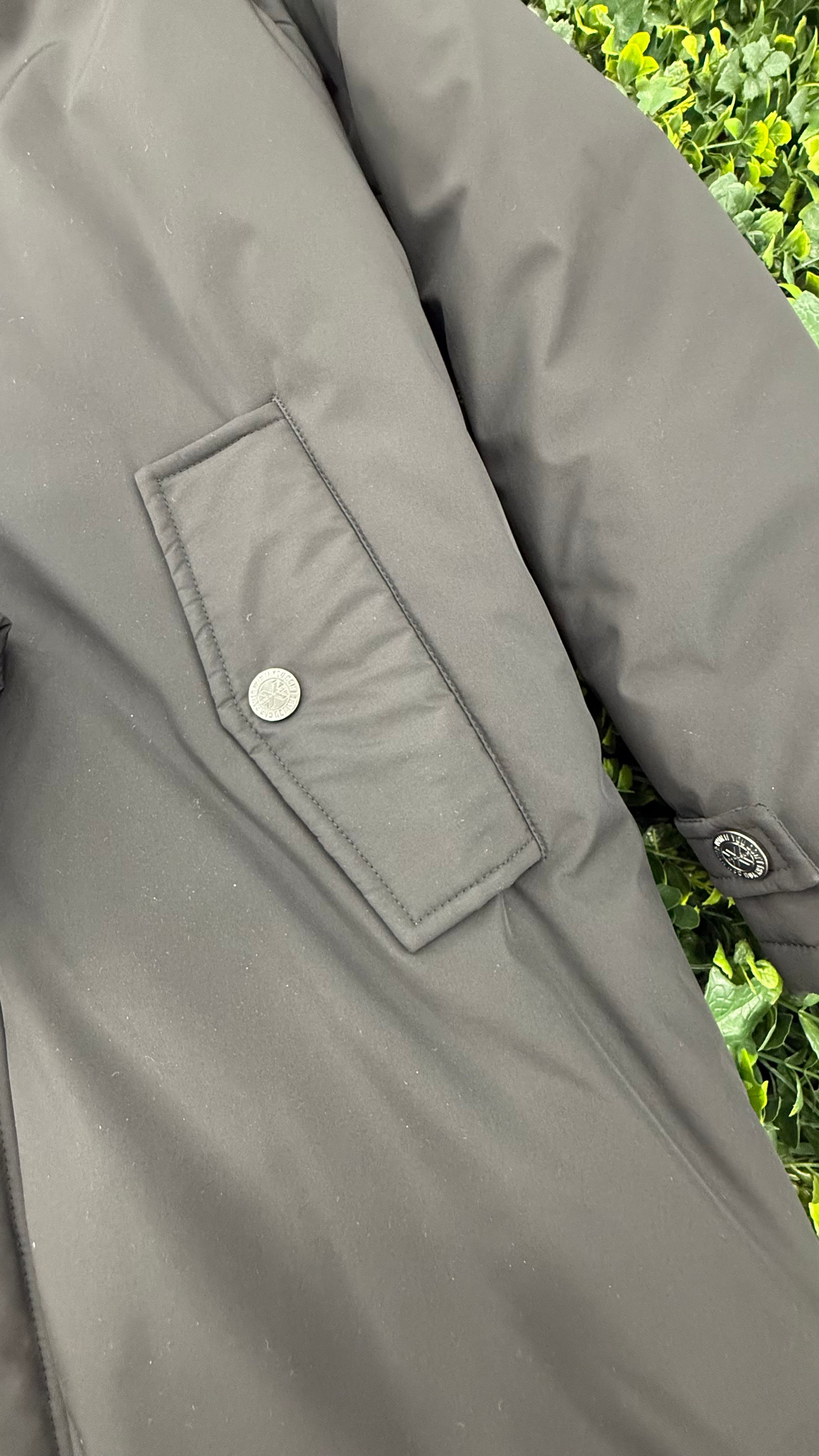 Chiusura con Cerniera frontale coperta da patta con bottoni automatici. Due tasche frontali con pattina e bottone a pressione. Polsini a Chiusura regolabile con bottone a pressione.