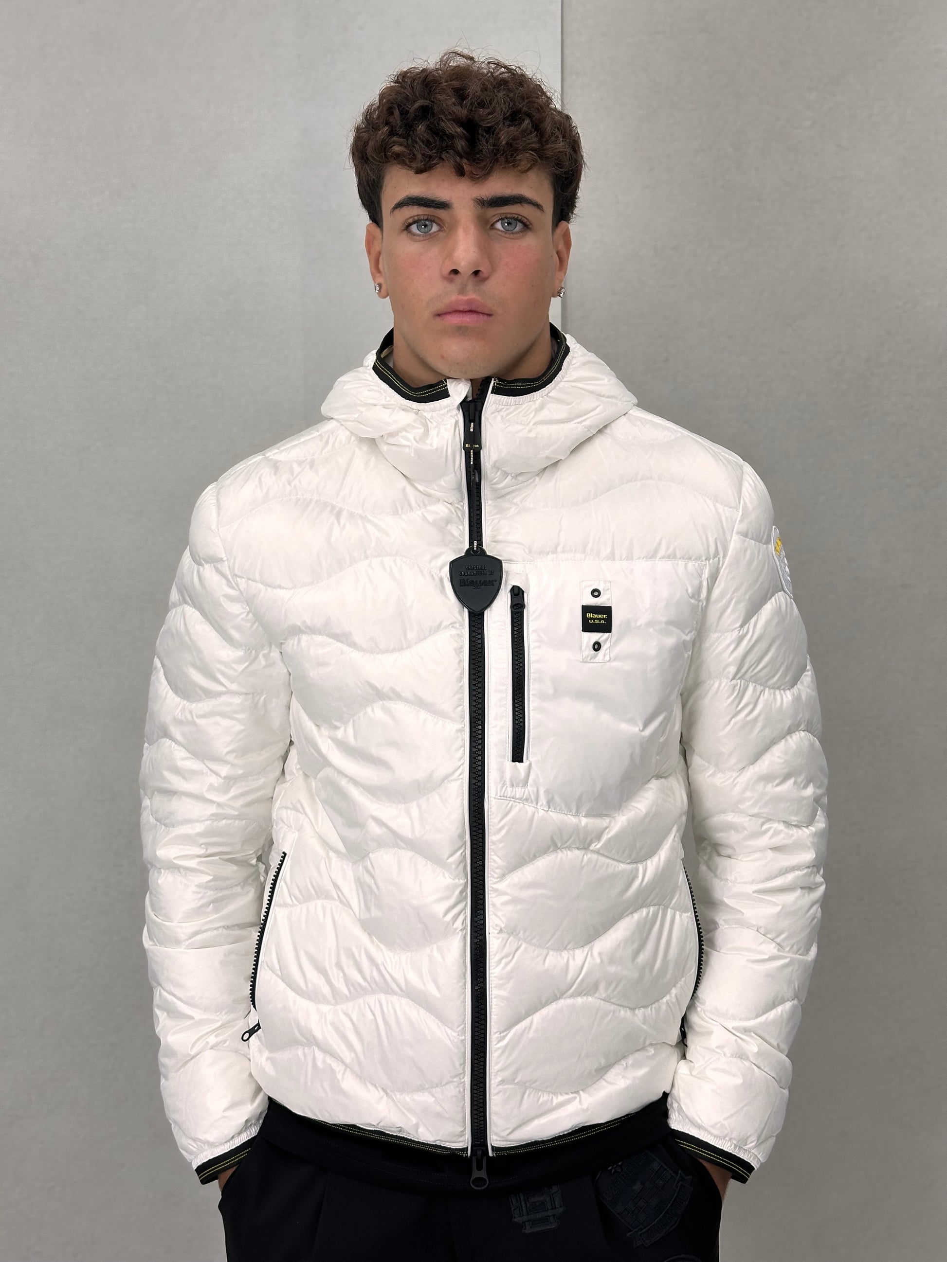 Piumino trapuntato ad onde orizzontali. Taschina applicata sul petto a sinistra per donare al capo iconico Blauer un tocco più funzionale. Imbottitura naturale in piuma, calda e non ingombrante; dedicato a chi vuole essere sempre alla moda in ogni occasione. Cappuccio fisso. Foderato in tono. Imbottito piuma 90/10 gr.165. Chiusura con zip. Copri cursore sul collo. Tasche con zip. Taschino con zip sul petto. Elastico rigato sul profilo del cappuccio, polsino e fondo. Tasche interne doppie: aperte e con velcro. Patch e passante con logo.