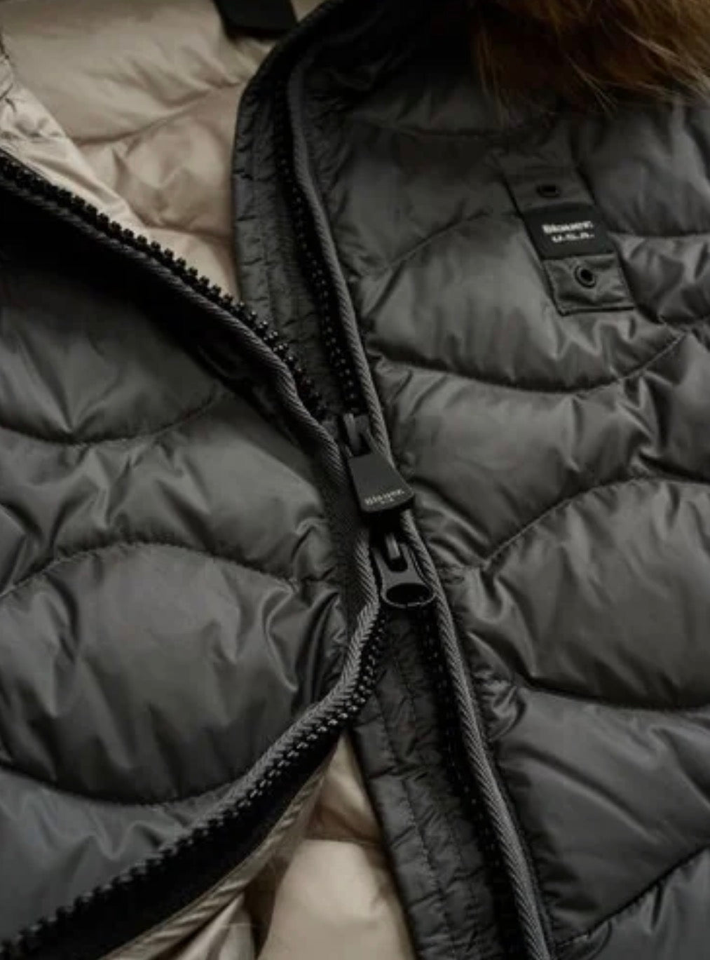 Piumino idrorepellente trapuntato ad onde orizzontali e con profilo del cappuccio in vera piuma. Capo iconico Blauer con imbottitura naturale, calda e non ingombrante, per essere sempre alla moda.