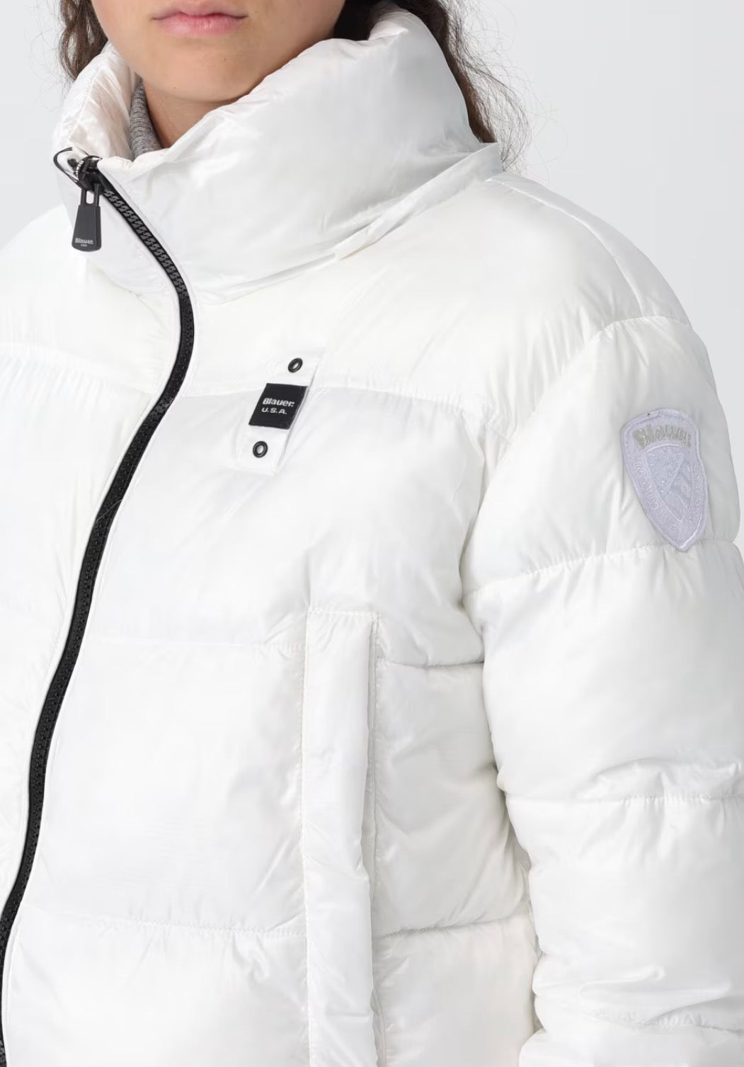 Giubbotto invernale in nylon micro rip idrorepellente con colletto alto removibile. Imbottitura sostenibile con impuntura a righe orizzontali con interno in contrasto colore, Cappuccio removibile tramite zip e Imbottito con ovatta Sorona, Fondo manica con linguetta e doppio automatico, tasche laterali e chiusura centrale con zip. Patch e passante con logo.