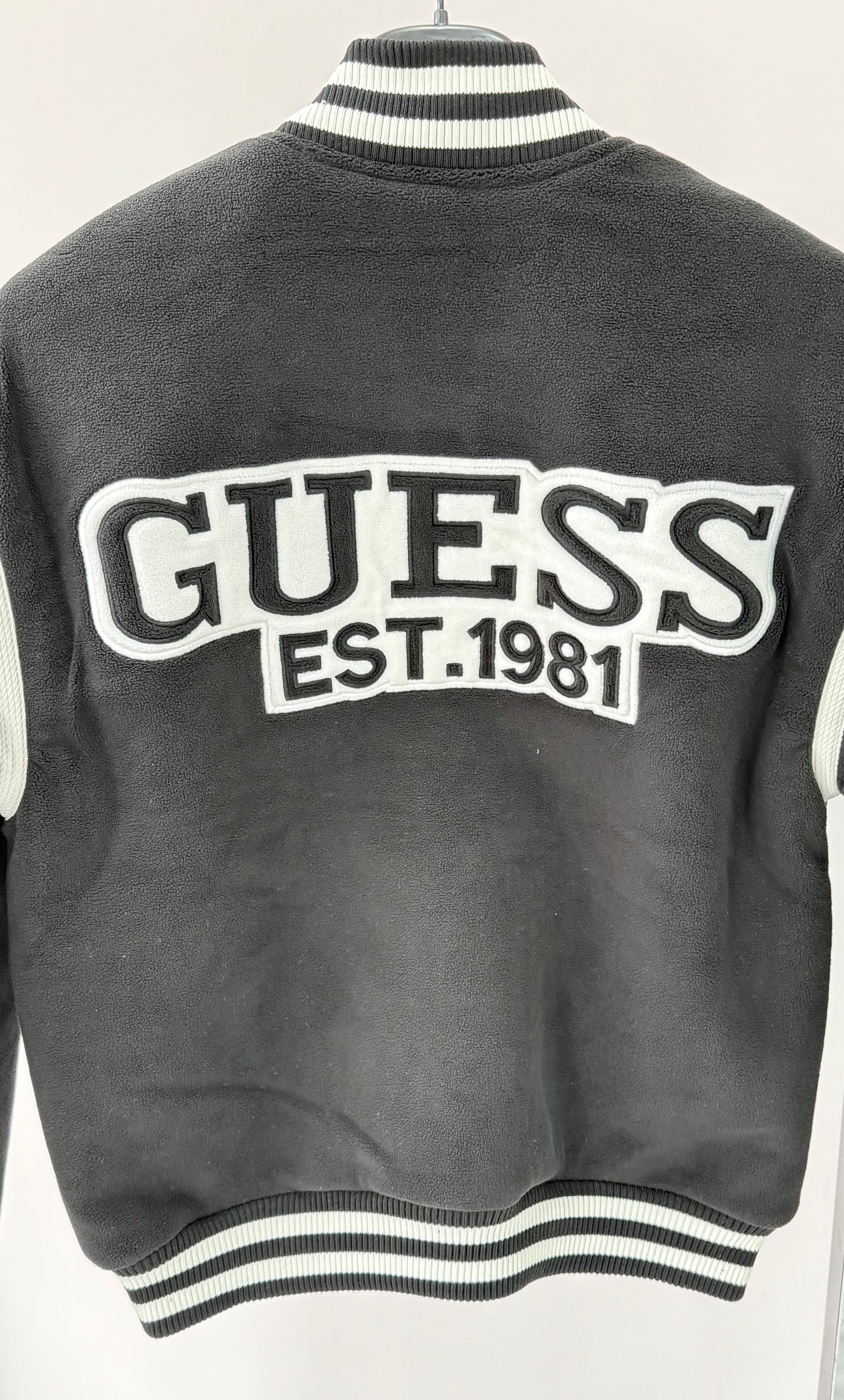 Bomber college effetto velluto, chiusura con bottoni, manica lunga.