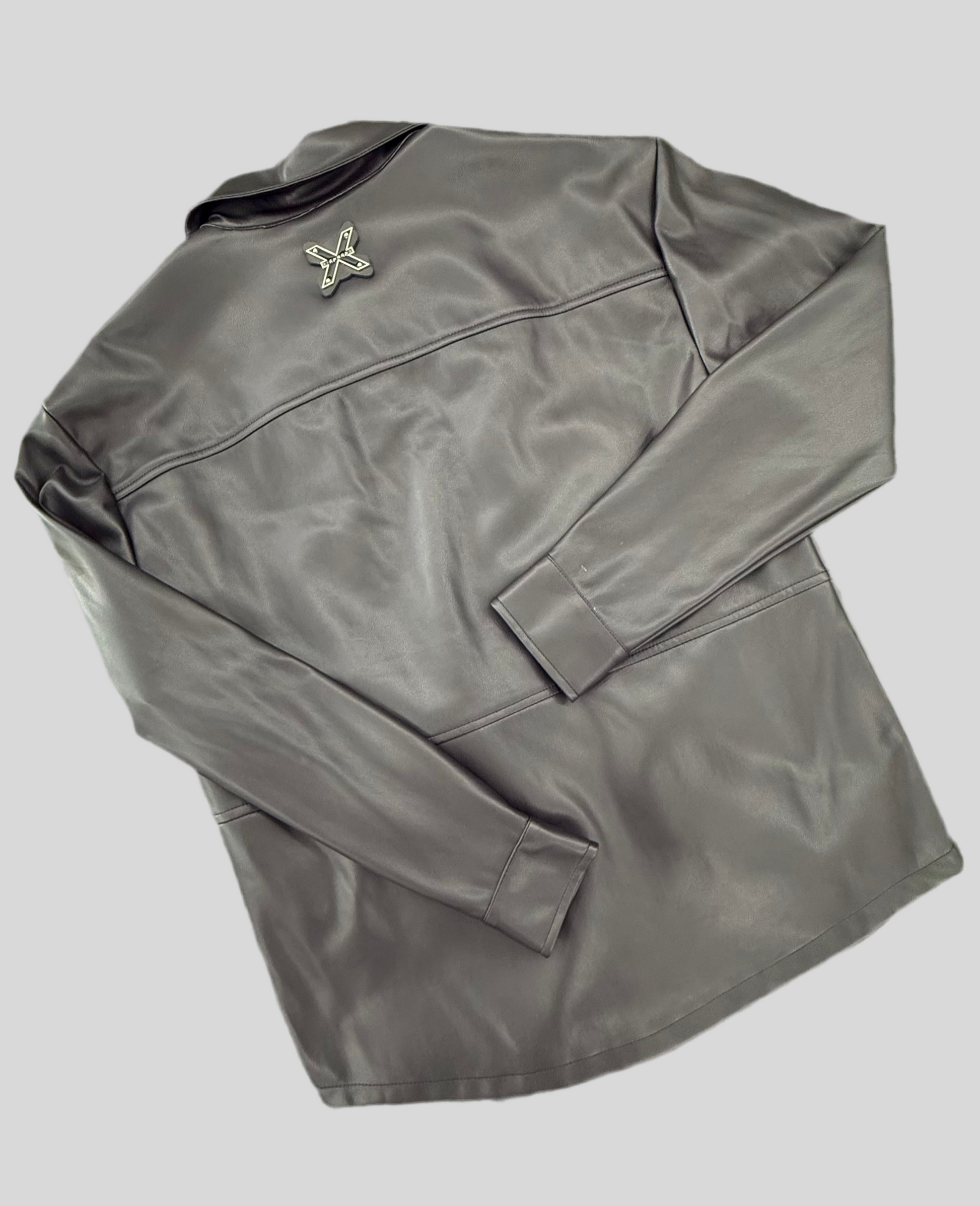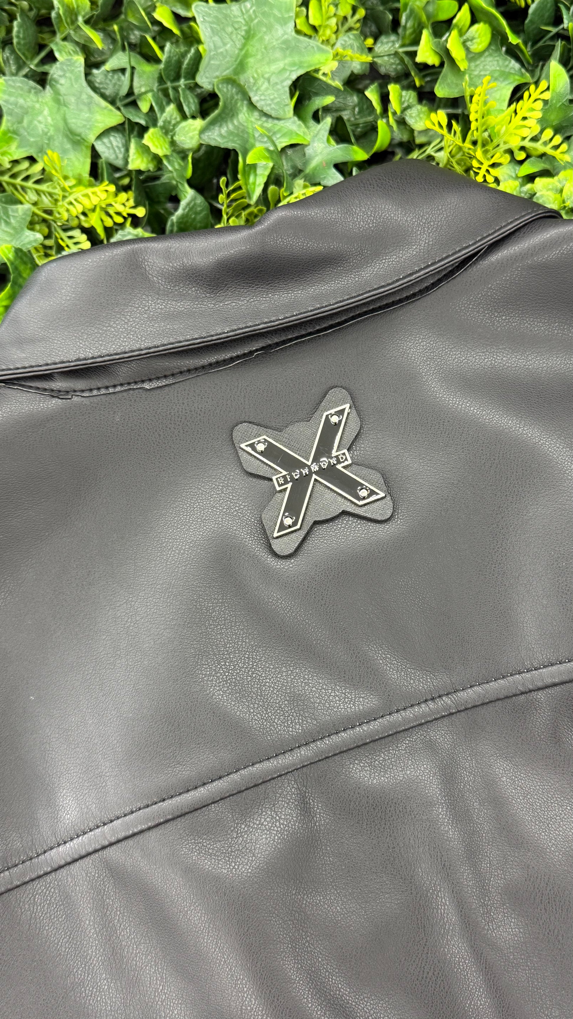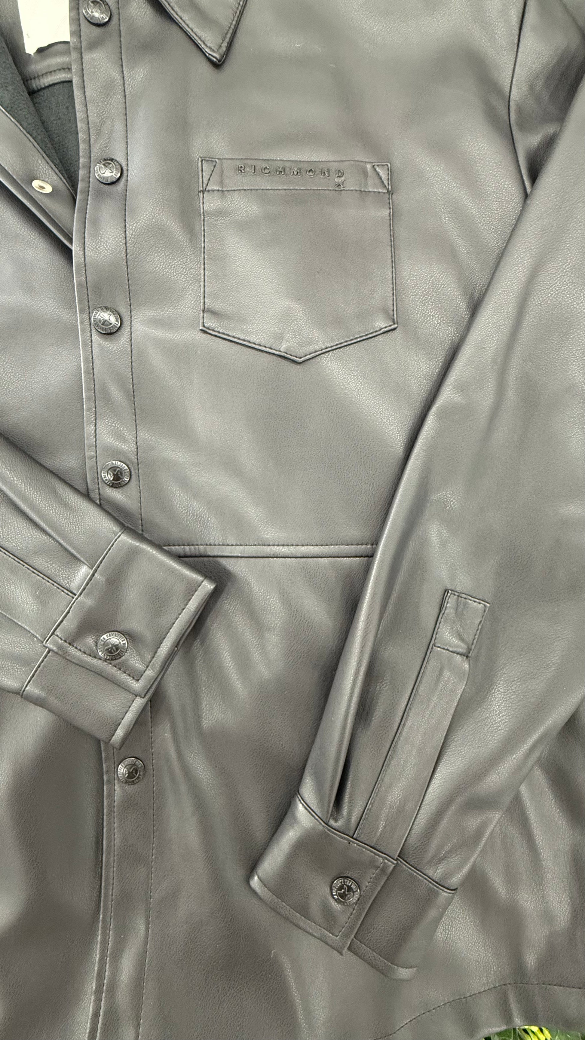 Giubbotto in similpelle nera, con finitura liscia e leggermente lucida. Chiusura con bottoni automatici a pressione lungo la parte anteriore. Colletto classico, rigido e a punta.