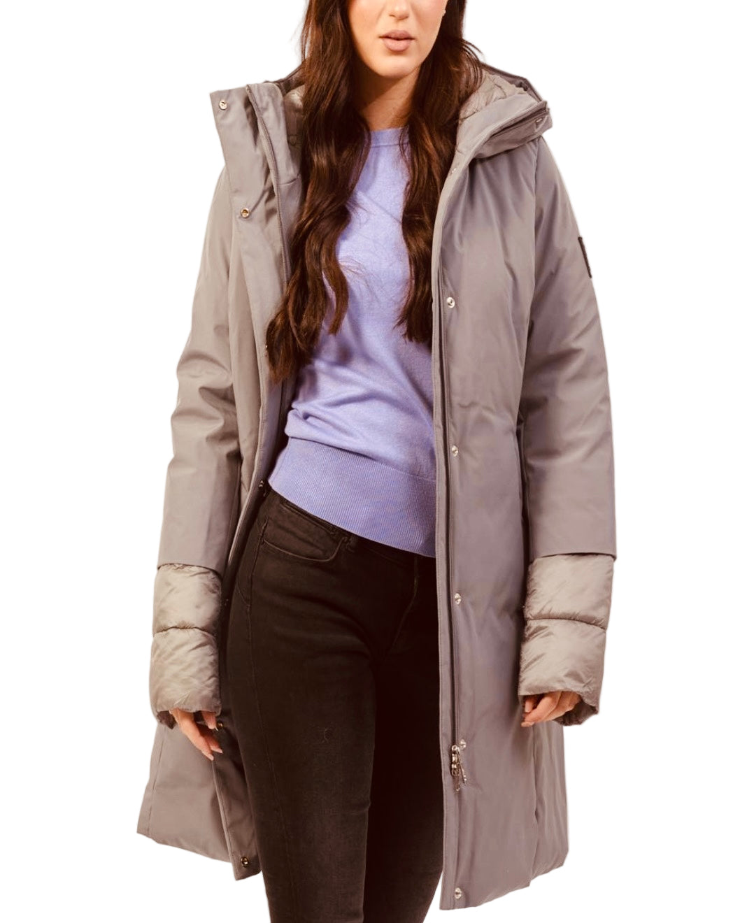 Giubbino donna Refrigue con cappuccio, chiusura con zip e bottoni a scomparsa, trapuntatura sul retro e sulle maniche, tasche laterali, patch logata sulla manica.