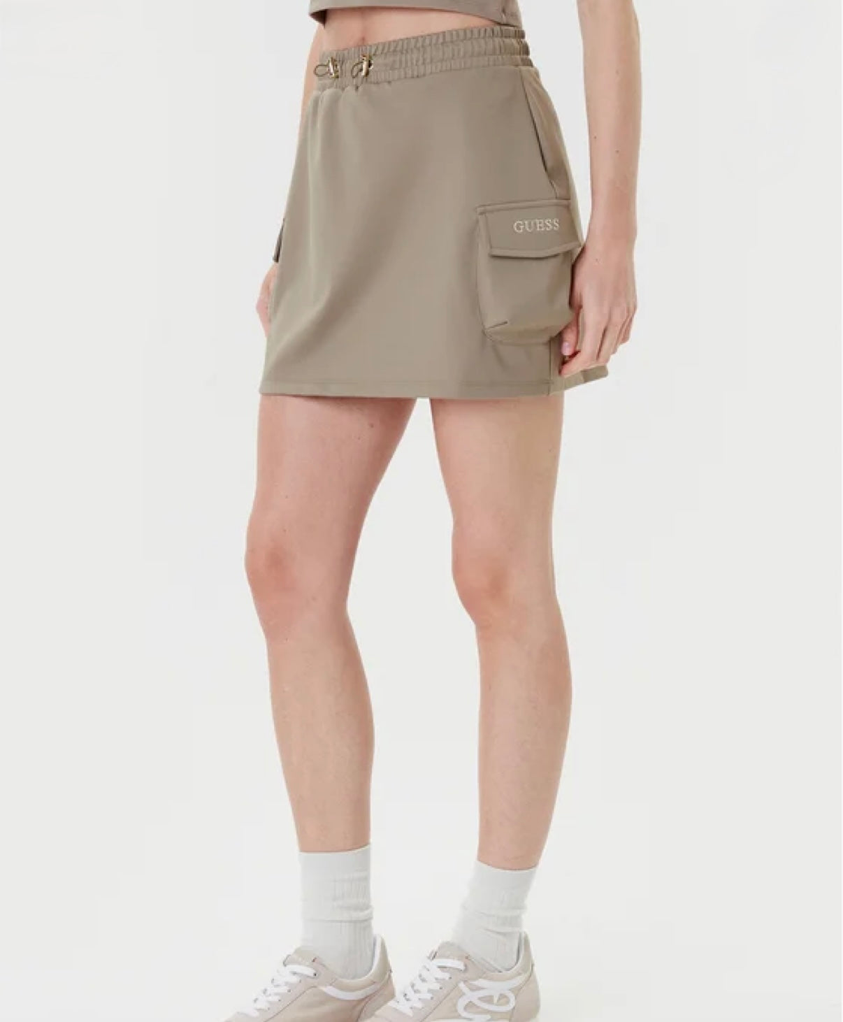 Minigonna cargo in nylon stretch, tasche laterali con patta, fascia in vita arricciata con coulisse.