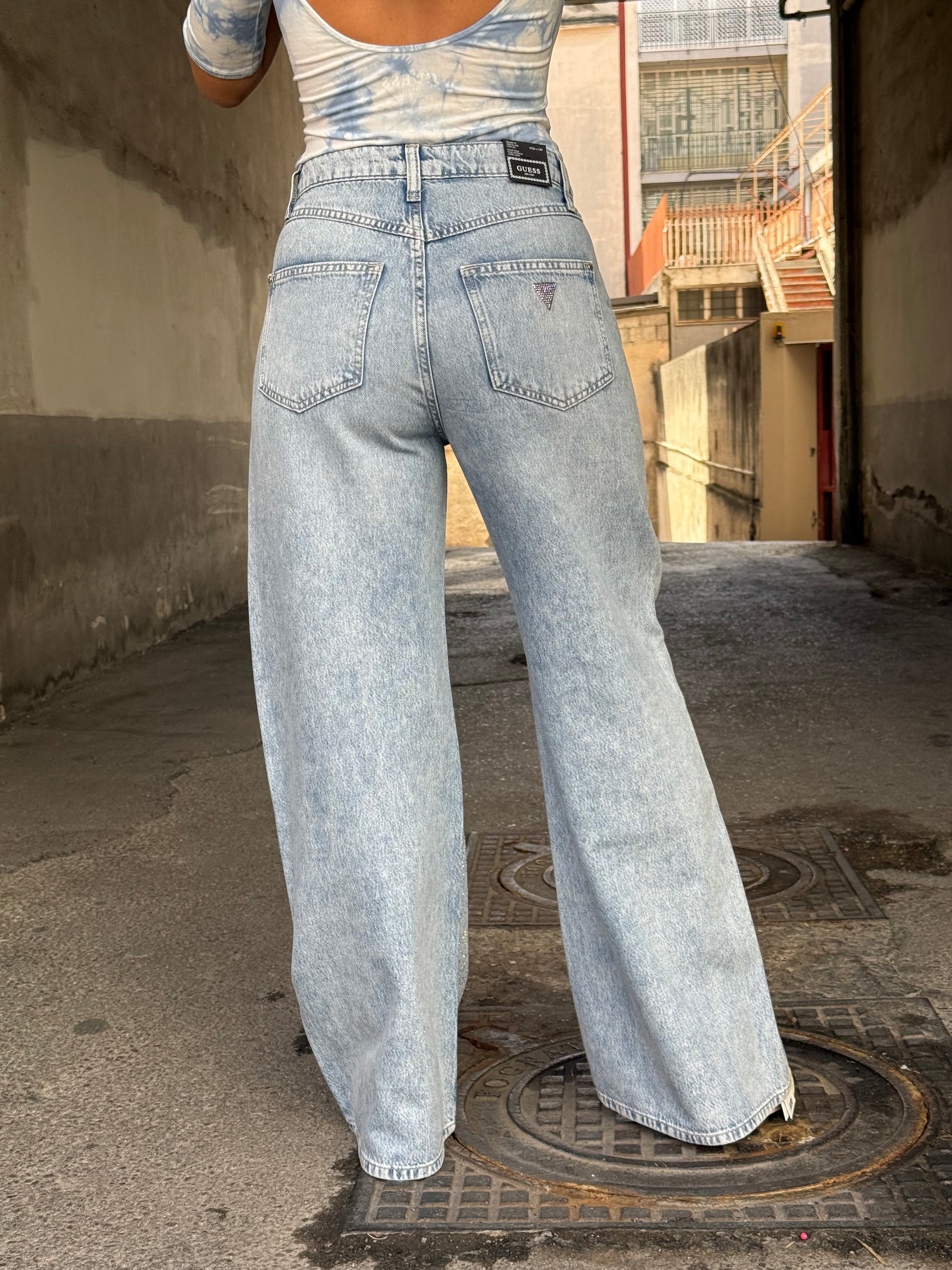 Jeans modello palazzo con applicazione di brillantini sulla parte anteriore del jeans. Creando un effetto luce