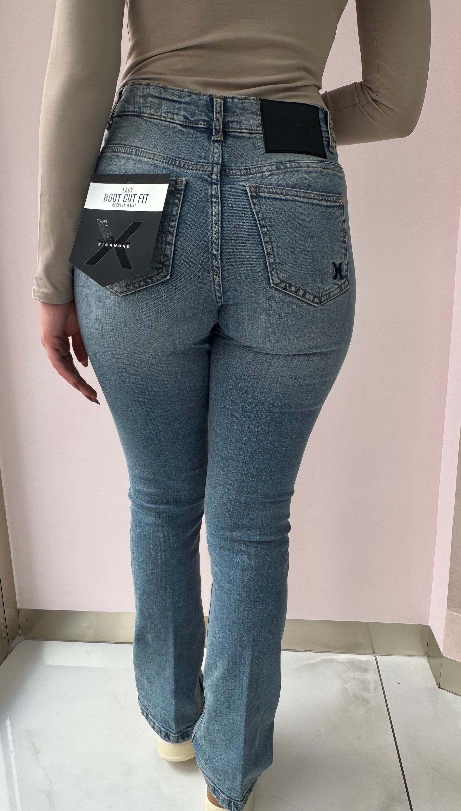 Il jeans RICHMOND è un modello a zampa leggermente svasata (bootcut), dal lavaggio celeste chiaro con lievi sfumature sul davanti e sul retro, che donano un effetto vissuto ma elegante.