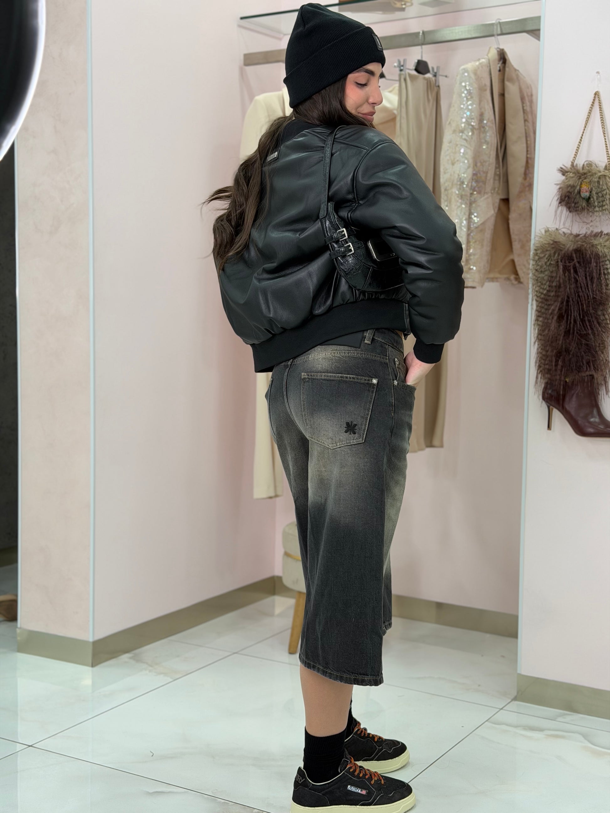 - Taglio: largo e dritto (modello “culotte” o “wide cropped”), con la gamba ampia che termina a metà polpaccio.
