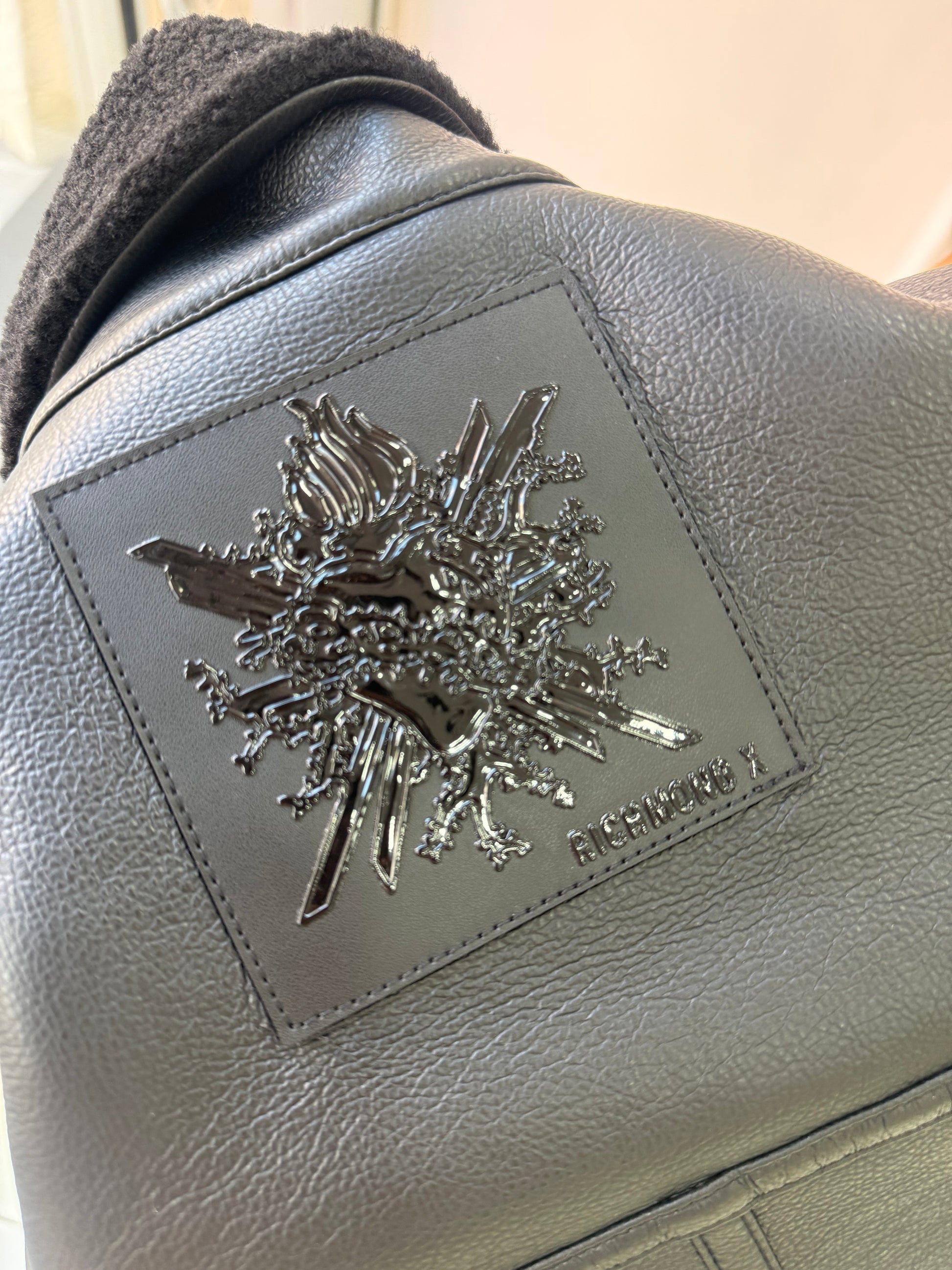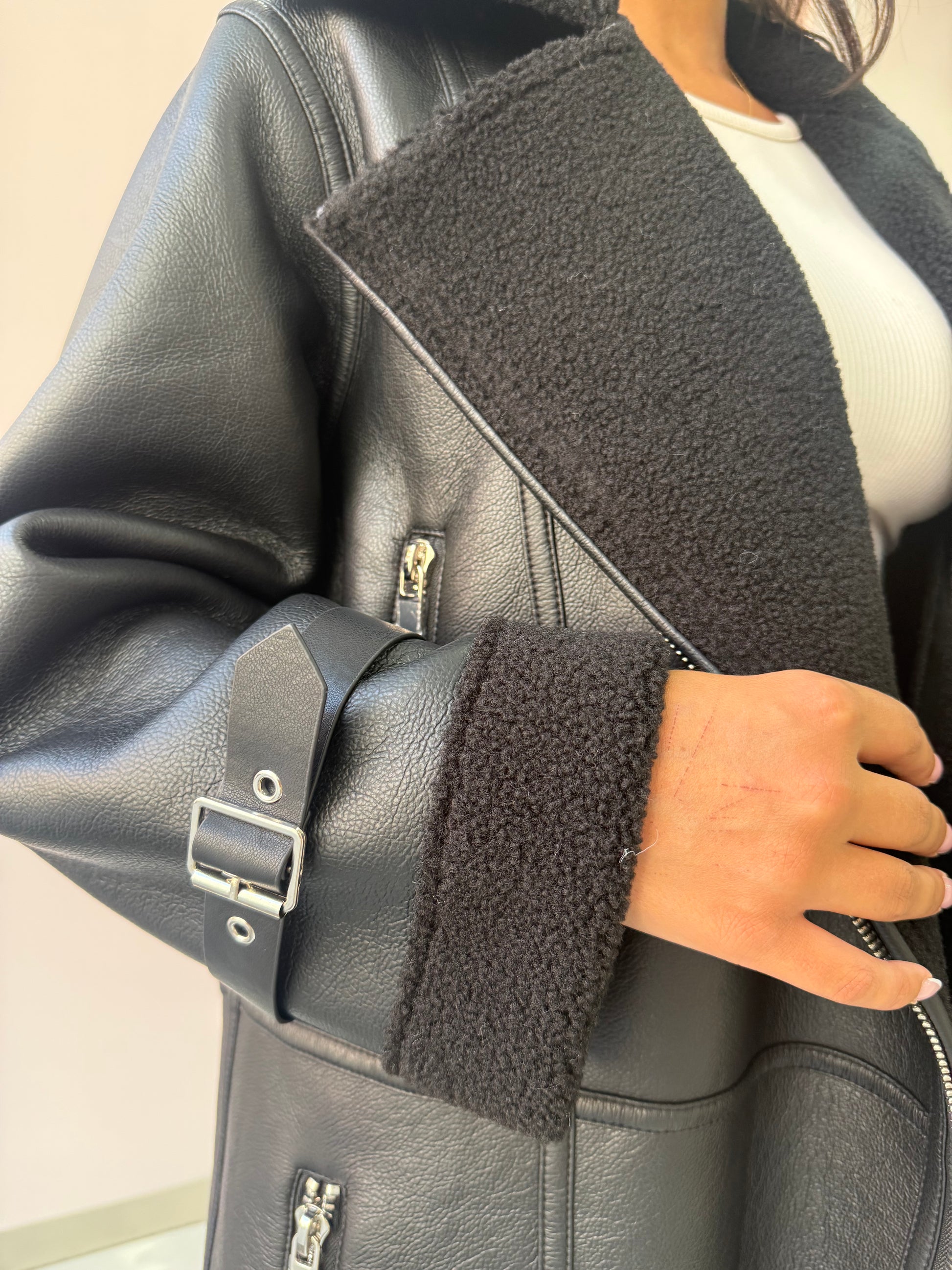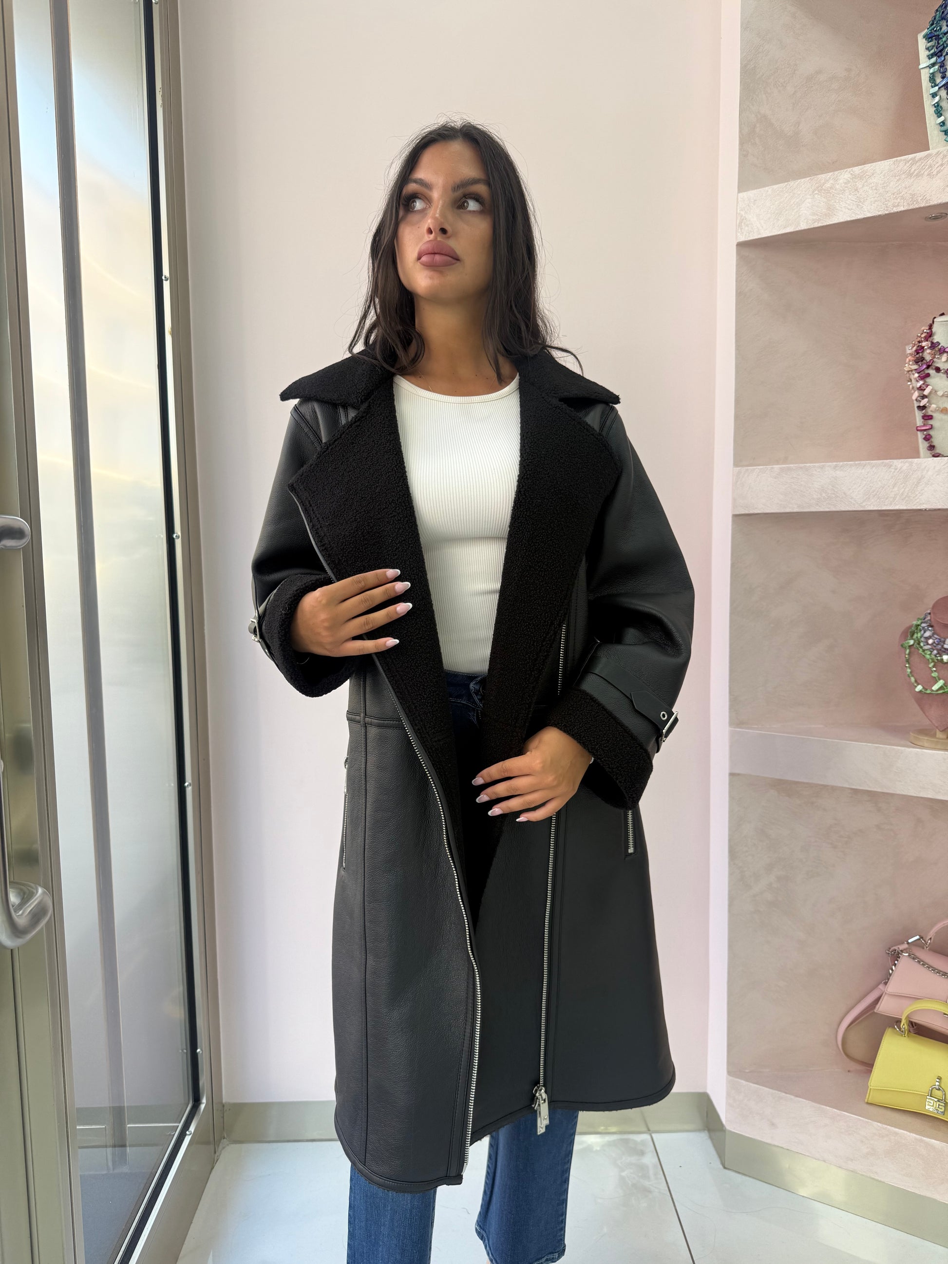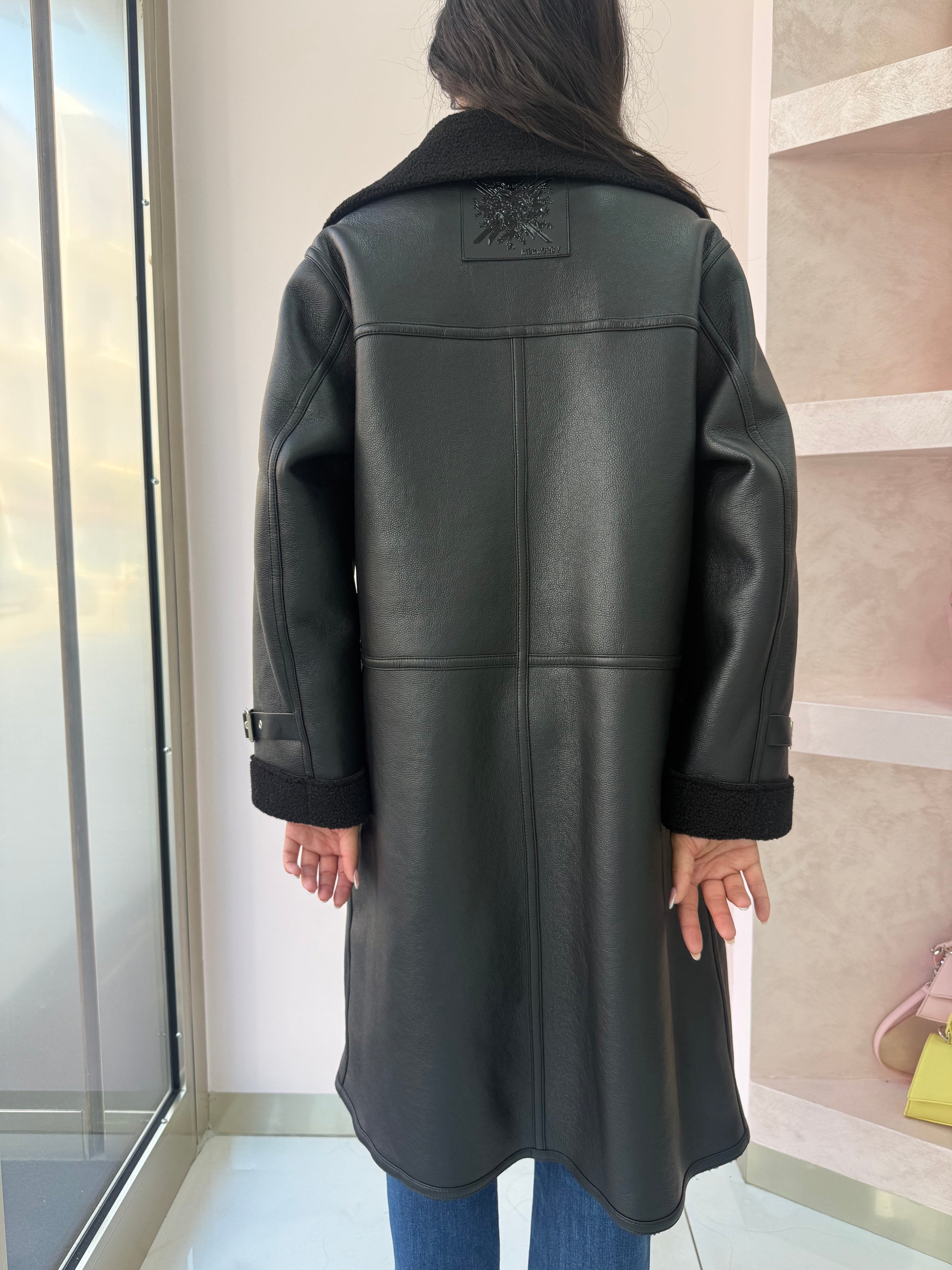 Montone lungo dal taglio dritto in ecopelle nera, con interno e dettagli in shearling (tessuto effetto pelliccia) anch’esso nero.