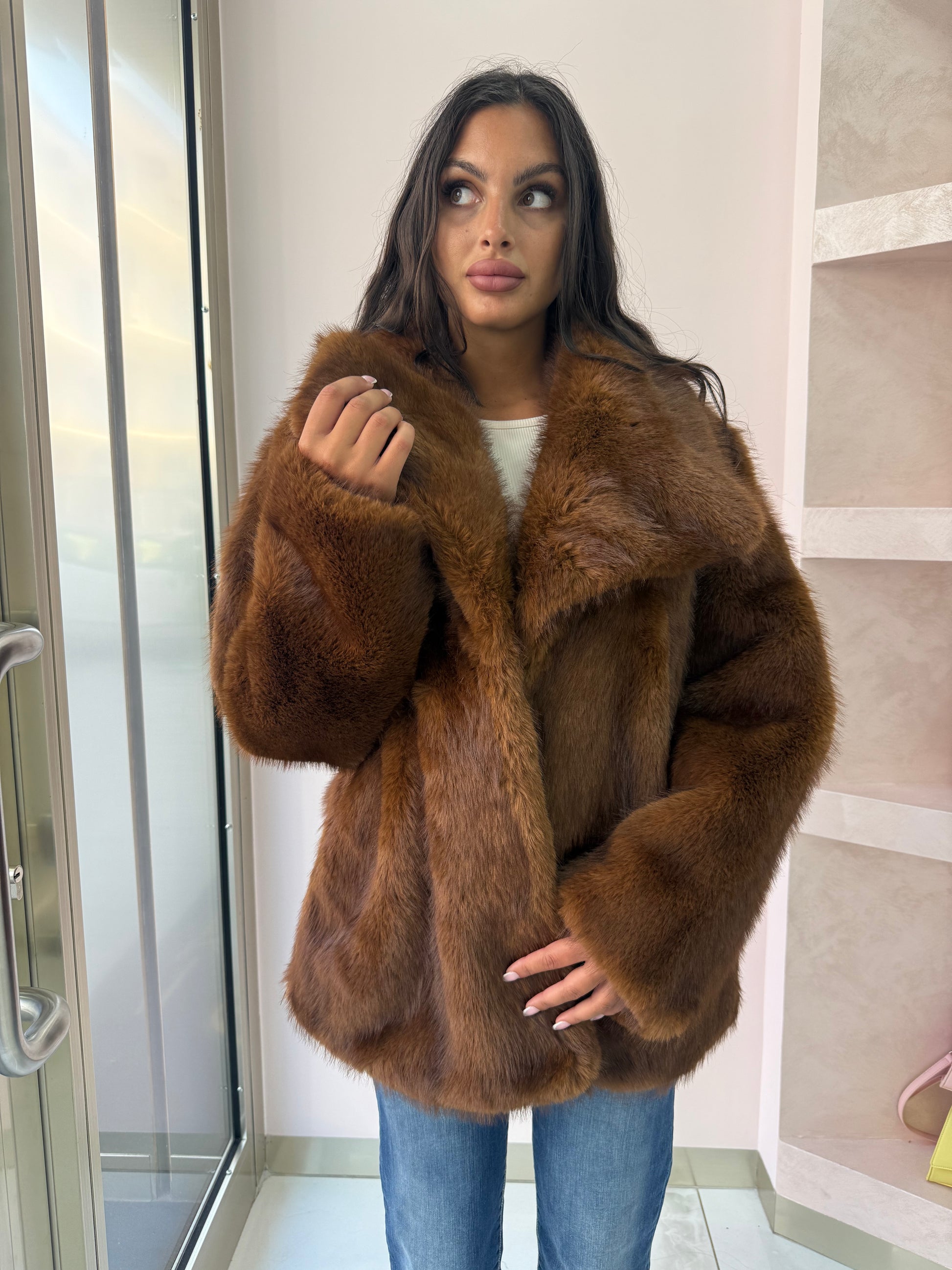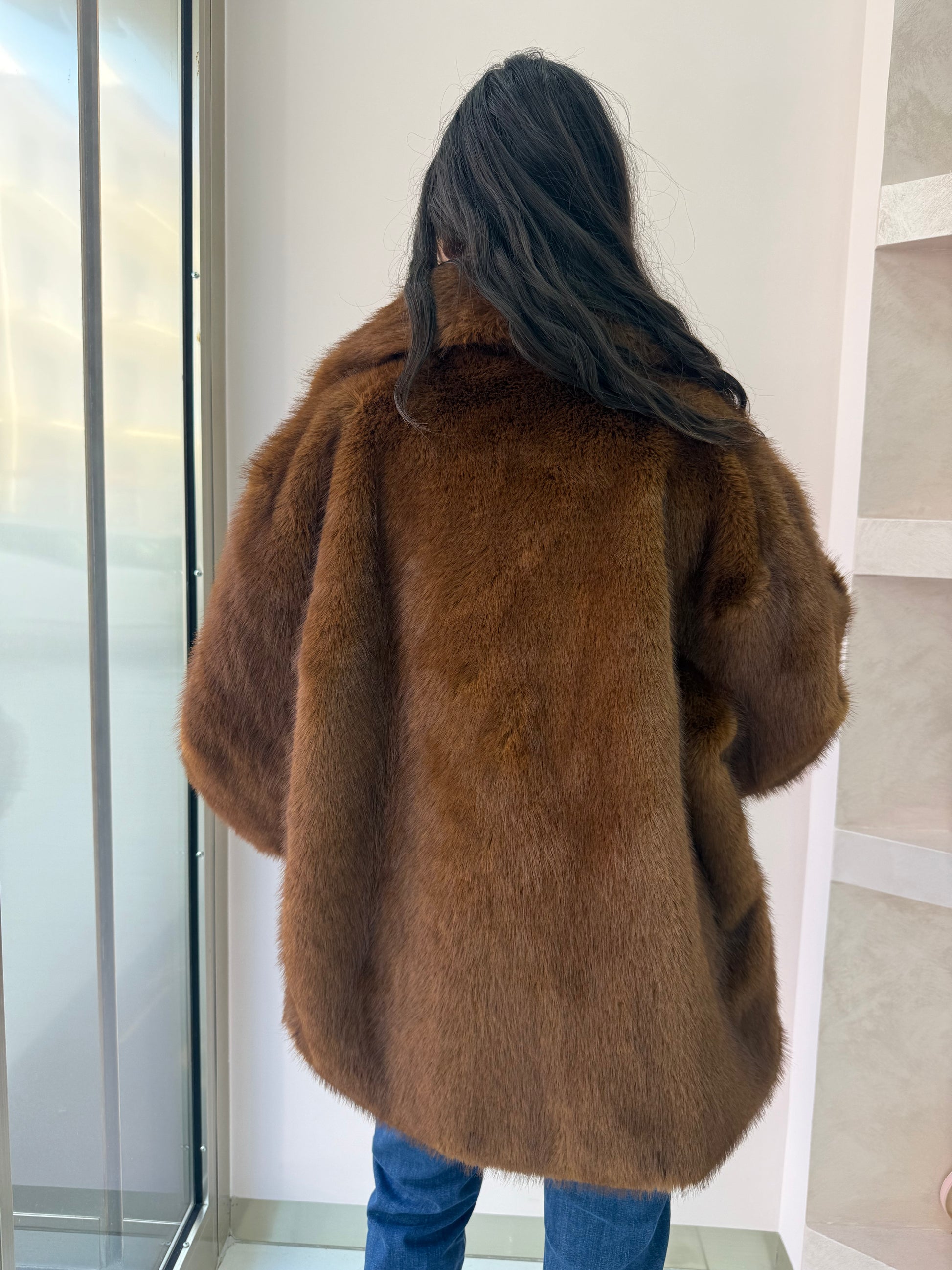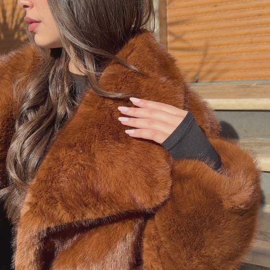 Giacca in eco-pelliccia di colore marrone caldo, con un taglio morbido e avvolgente. Effetto lucido e soffice.