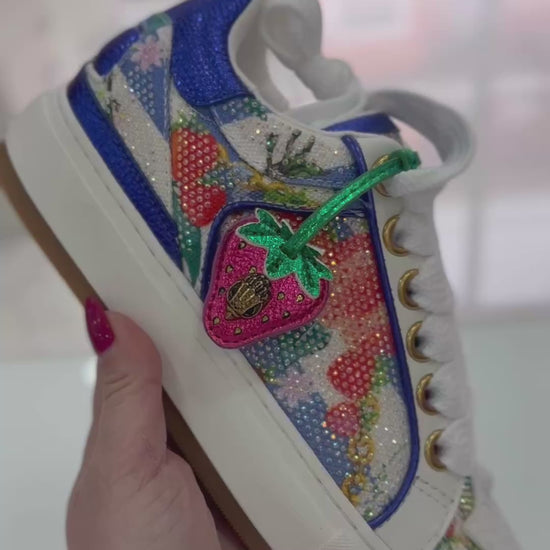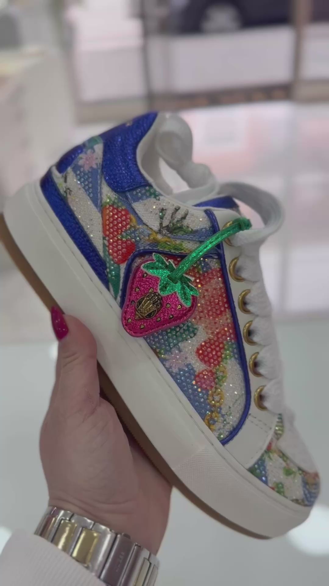 un mix unico di stile e dettagli luxury. Realizzate in canvas con stampa fragola e cristalli iridescenti, presentano un’esclusiva targhetta con motivo fragola e testa d'aquila in ottone anticato sui lacci. Con una suola di 3.5 cm, offrono un look distintivo e alla moda. Attenzione: vestibilità ridotta, consigliamo una taglia in più. Aggiungi un tocco esclusivo al tuo outfit con queste sneakers iconiche!