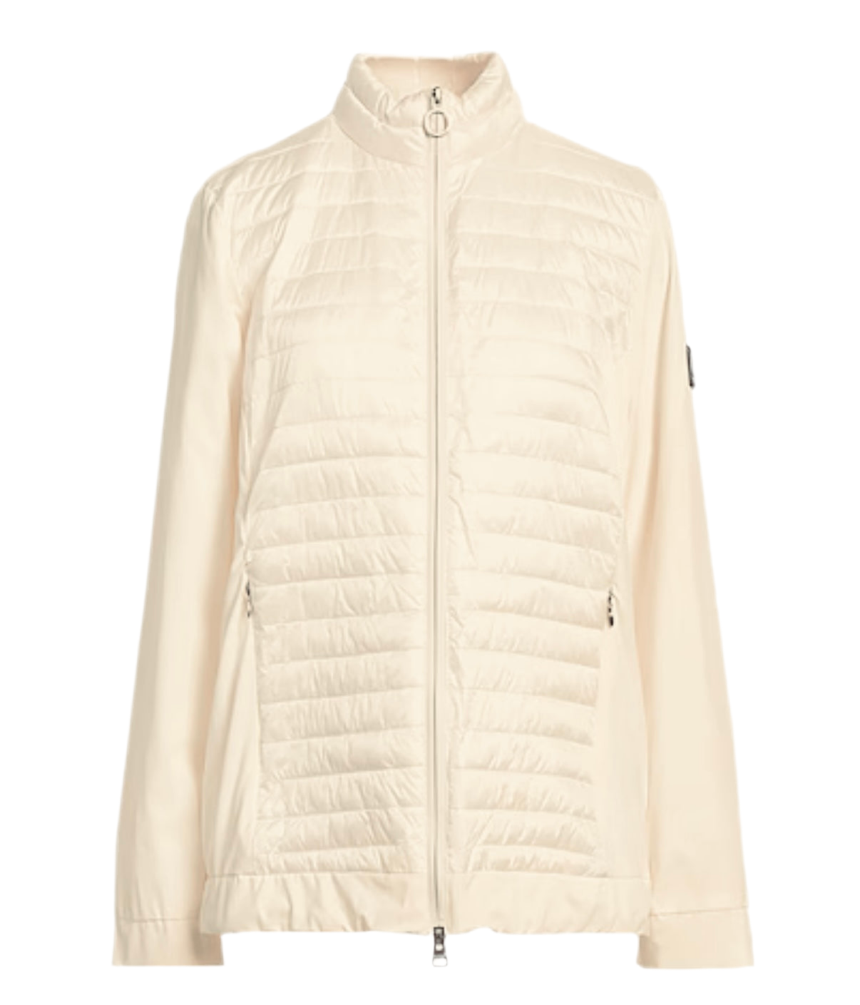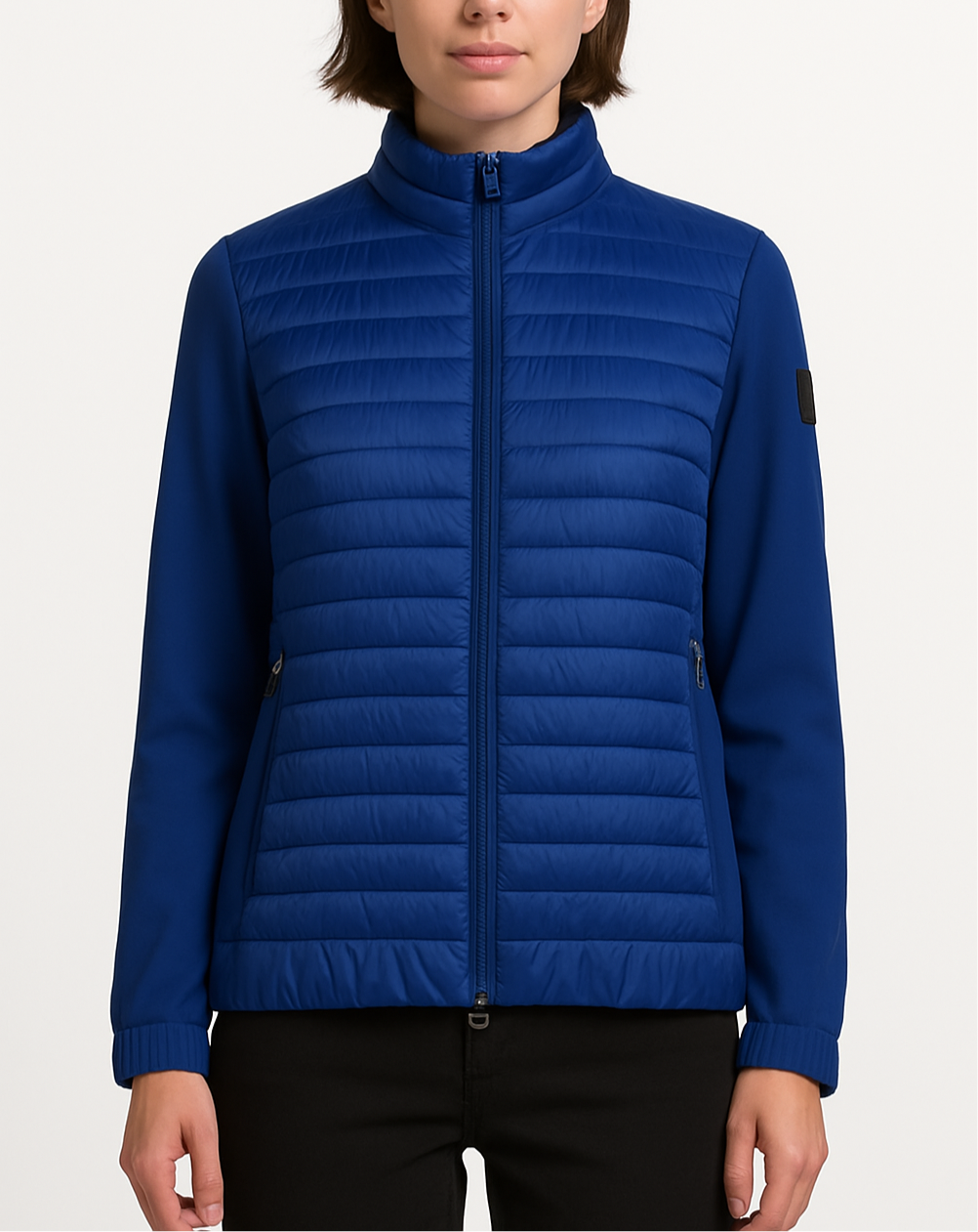 Giubbotto leggero da donna in tessuto tecnico liscio con pannelli frontali trapuntati a orizzontale, imbottiti per garantire comfort termico. Il design presenta collo alto con zip centrale a doppio cursore in metallo, due tasche laterali con chiusura a zip nascosta e maniche lisce senza trapuntatura per un look più lineare. Il fondo è leggermente elasticizzato per una migliore vestibilità. Sul braccio sinistro è applicato un piccolo patch logato. Lo stile minimal e raffinato lo rende versatile, adatto sia ad outfit casual che sportivi.