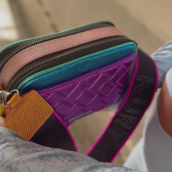 La borsa Kensington Drench è realizzata in pelle martellata metallizzata di diversi colori all'esterno, con la caratteristica trapuntatura imbottita effetto parquet. La parte anteriore è impreziosita da una testa d'aquila in argento anticato con cristalli.