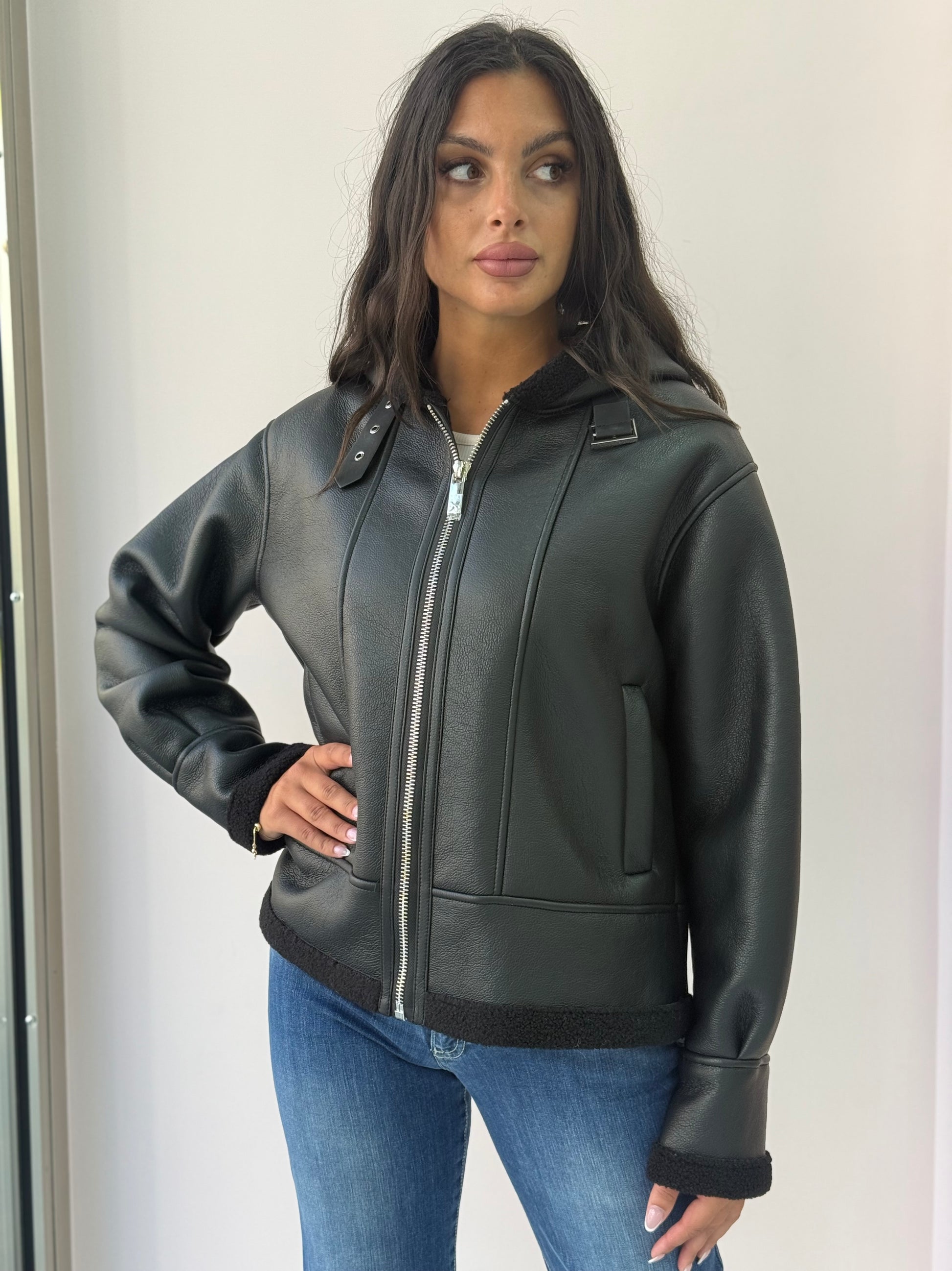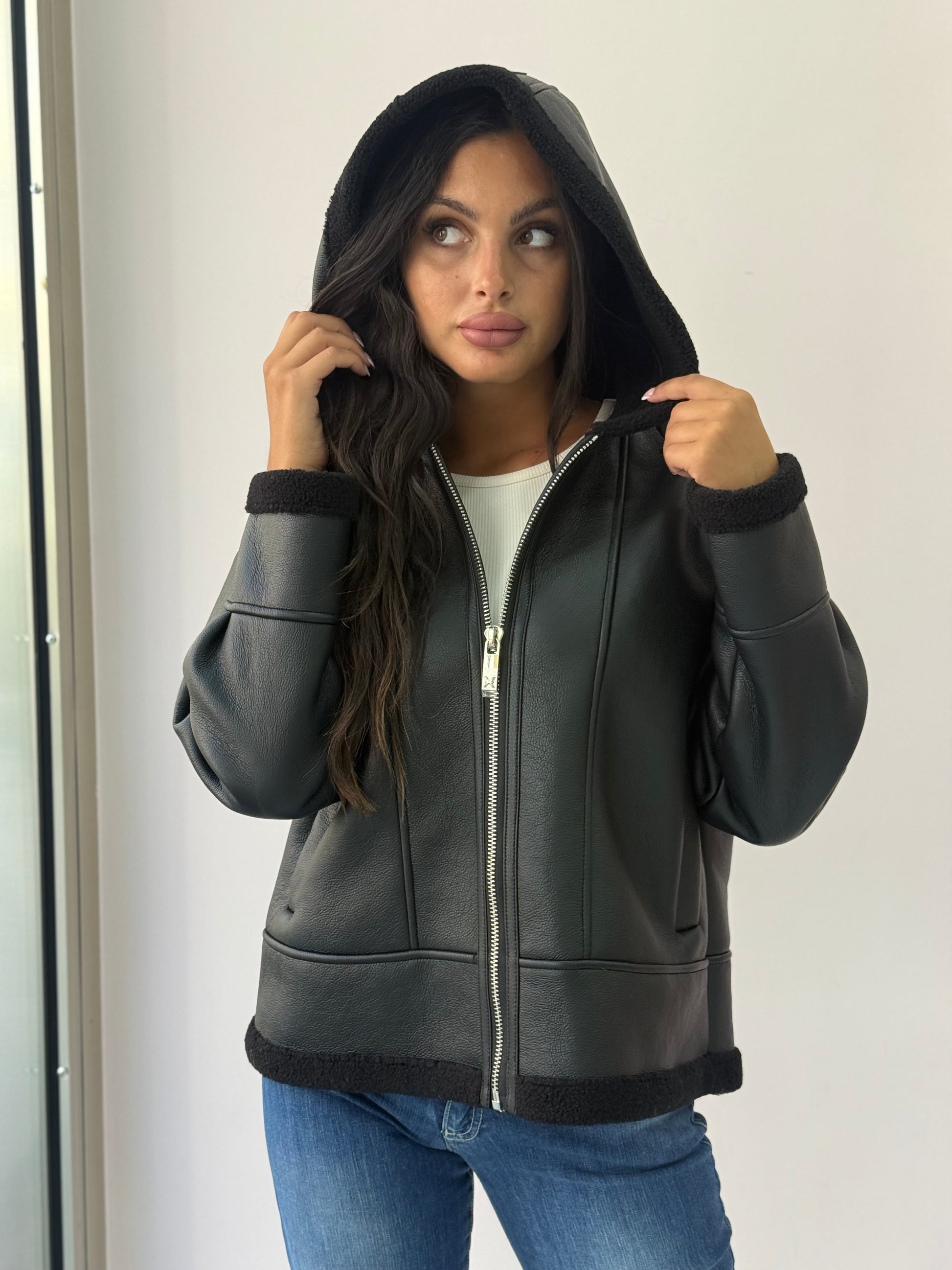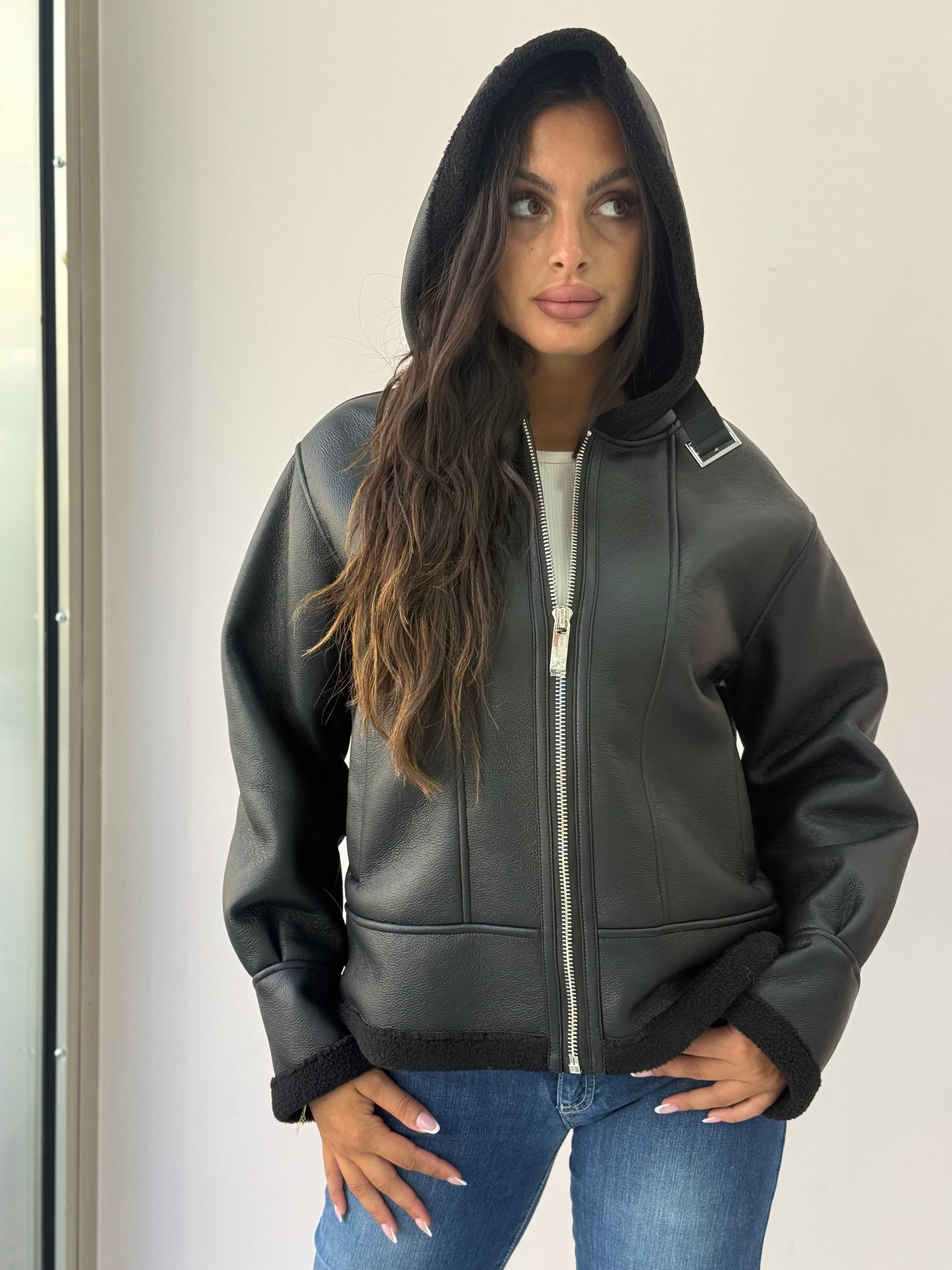 - Colore interno, Nero, in materiale effetto pelliccia, visibile sul bordo del cappuccio, dei polsini e del fondo.