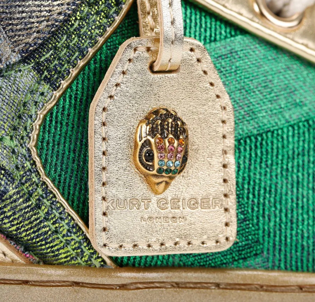 La sneaker Southbank Tag presenta una tomaia in denim multicolore con finiture in oro metallizzato. I lacci sono impreziositi da una linguetta in pelle color oro metallizzato con una testa d'aquila in ottone anticato e cristalli arcobaleno sulla parte superiore.