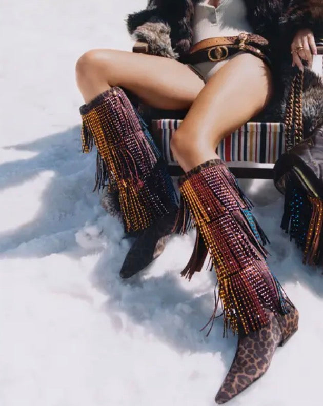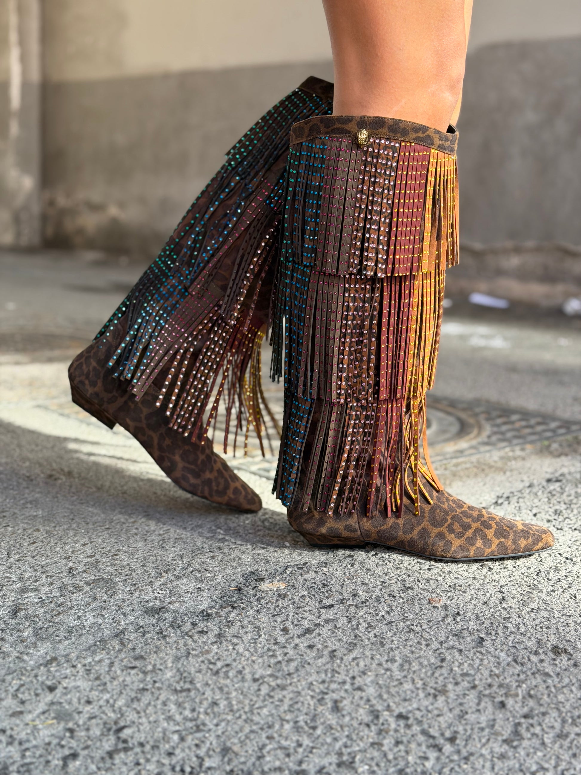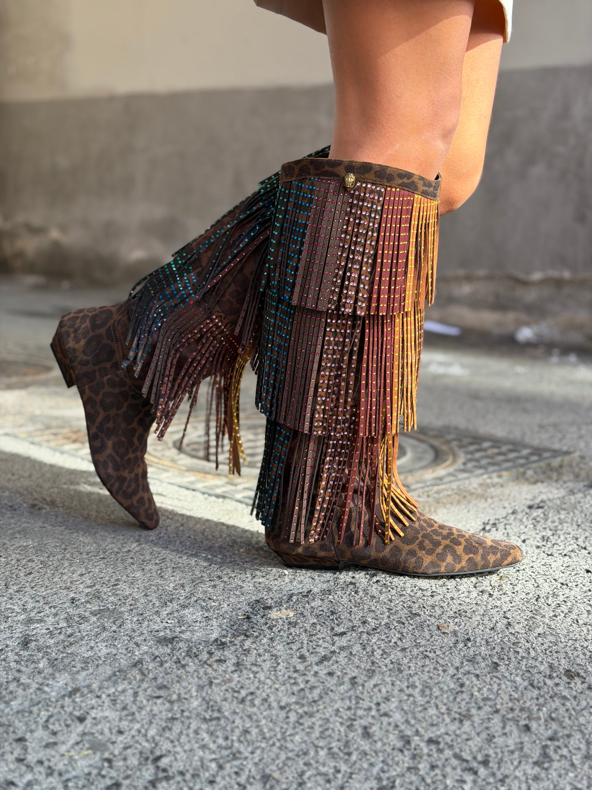 Questo stivale Western Fringe Pull On è realizzato in pelle scamosciata stampata leopardata con frange impreziosite da cristalli lungo la caviglia.