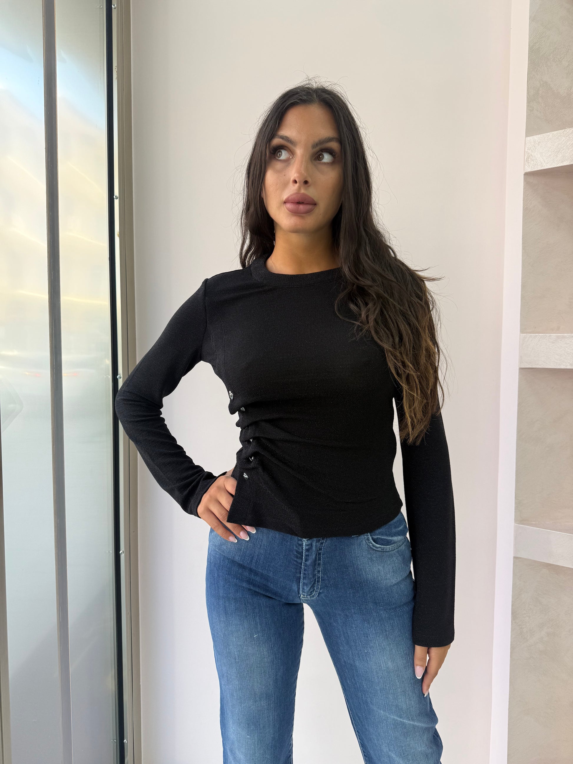 La maglia in lurex di colore nero ha uno stile semplice ma con dettagli interessanti. Modello a maniche lunghe, aderente. Presenta una arricciatura laterale sul fianco sinistro con bottoncini decorativi (cuore sacro).