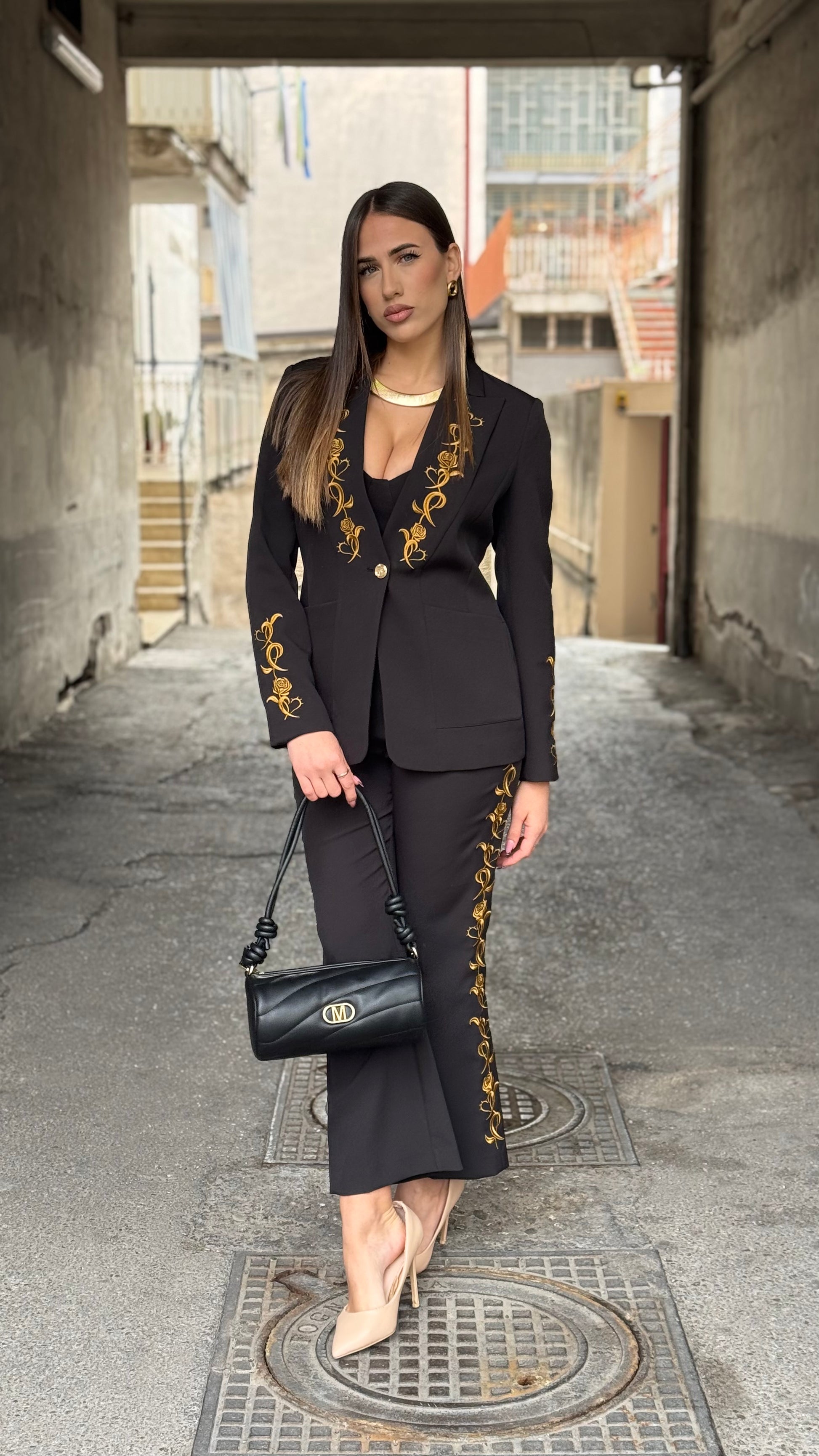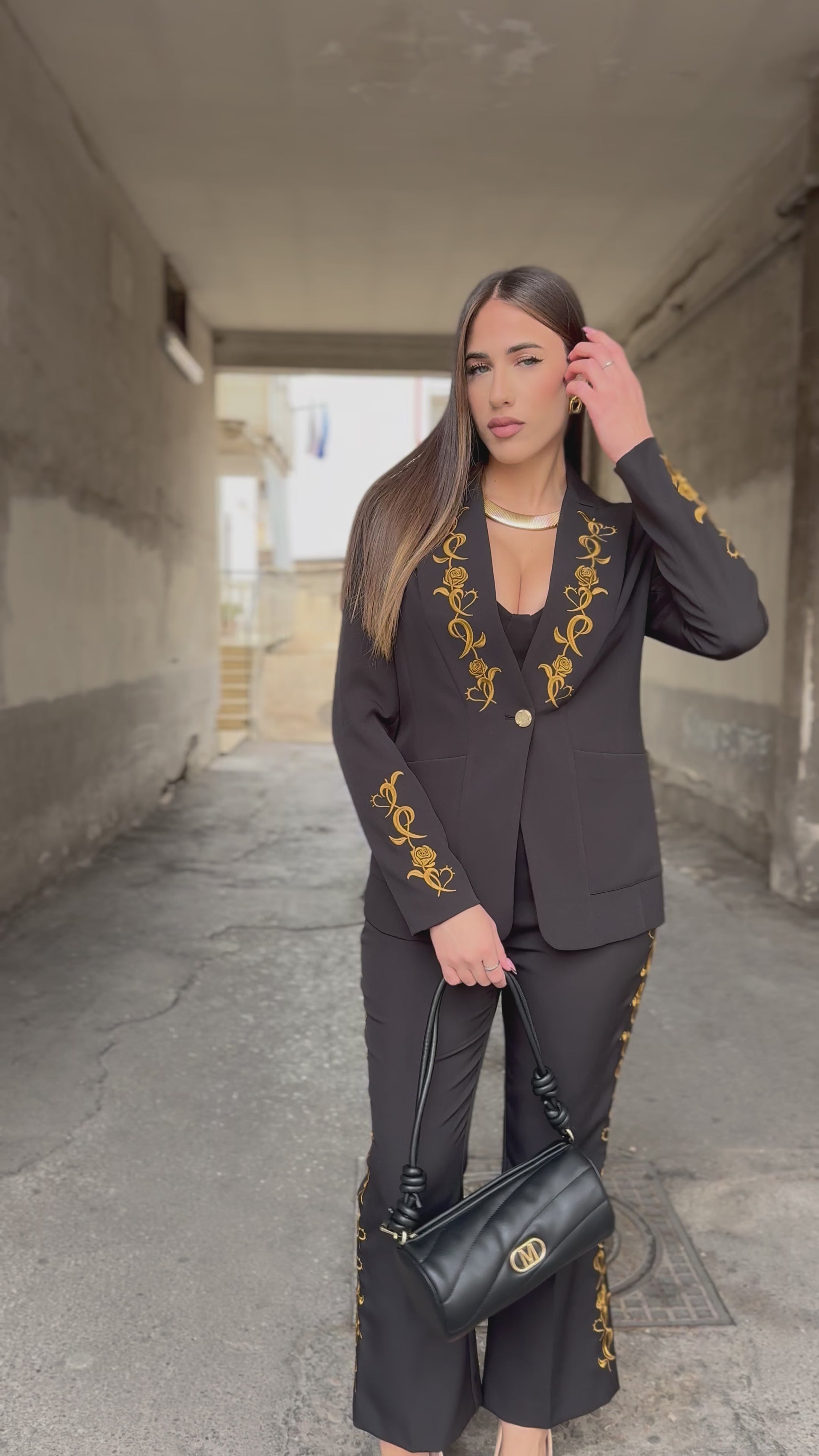 Un tailleur elegante e moderno DENNY ROSE, con uno stile unico e sofisticato. I dettagli accurati e l'alta qualità dei materiali rendono questo capo perfetto per qualsiasi occasione, dalla riunione di lavoro all'evento serale. Lasciati conquistare dal fascino e dalla raffinatezza di questo tailleur.