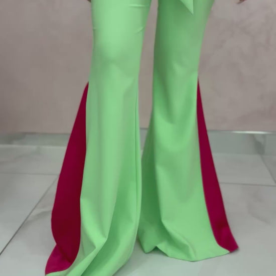 Tailleur composto da giacca con spalline imbottite, senza bottoni e cintura in vita con Swaroski colorati. Pantalone a vita alta modello a zampa con chiusura zip laterale a scomparsa.